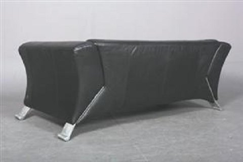 Rolf Benz. Three-seater sofa upholstered in black leather with 'Maori' pattern of bone aluminum. Produced by Benz furniture production model 322nd L. 205 cm. 5000 m2 showroom