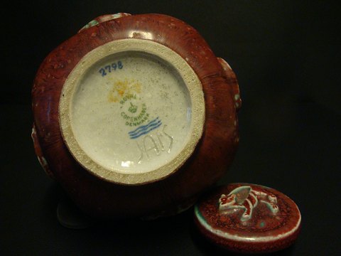SoldRoyal Copenhagen vase with lid in oxblood glaze with relief decoration. Sign Jais Nielsen. In perfect condition.