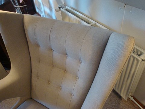 Papa Bear Chair "wing chair" AP19 Design from 1951 by Hans J. Wegner 1914-2007. Chair measures 99cm in height, 55 cm in width, 90cm in length and seat height 43cm. The chair is in a light woll with paws and legs in teak