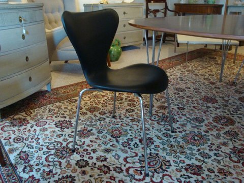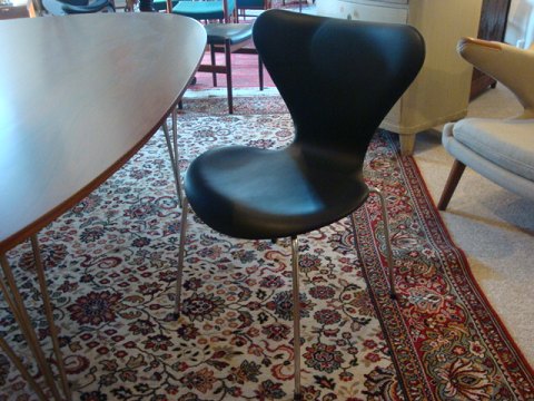 Arne Jacobsen syver stol, model 3107. Stolen er nybetrukket med sort læder. 2 års garanti.