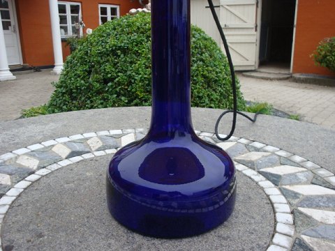 Holmegaard bordlampe i blåt glas. Lampen måler 39cm i højden.