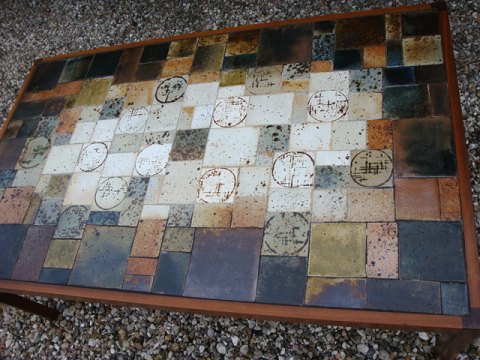 SolgtSofabord med kakler. Træet er mahogni og godt bordet er af godt dansk design fra 1960érne.