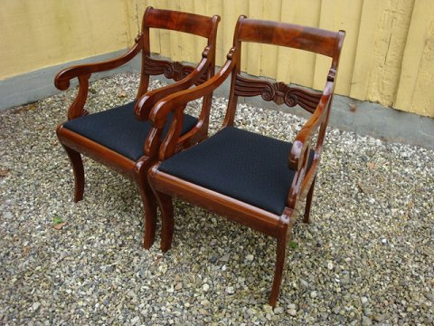 2 Late empire chairs from the year 1860. The chairs are hand polished mahogany. Upholstered in black fabric. They are in good condition.