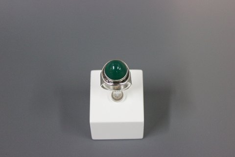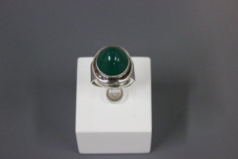 Sølvring i sterling med grøn cabochon slebet agat designet af Bjørklund mellem 1961-1971, sign. Brd.B. Str 53.