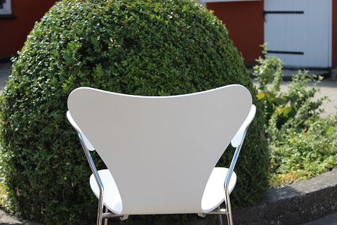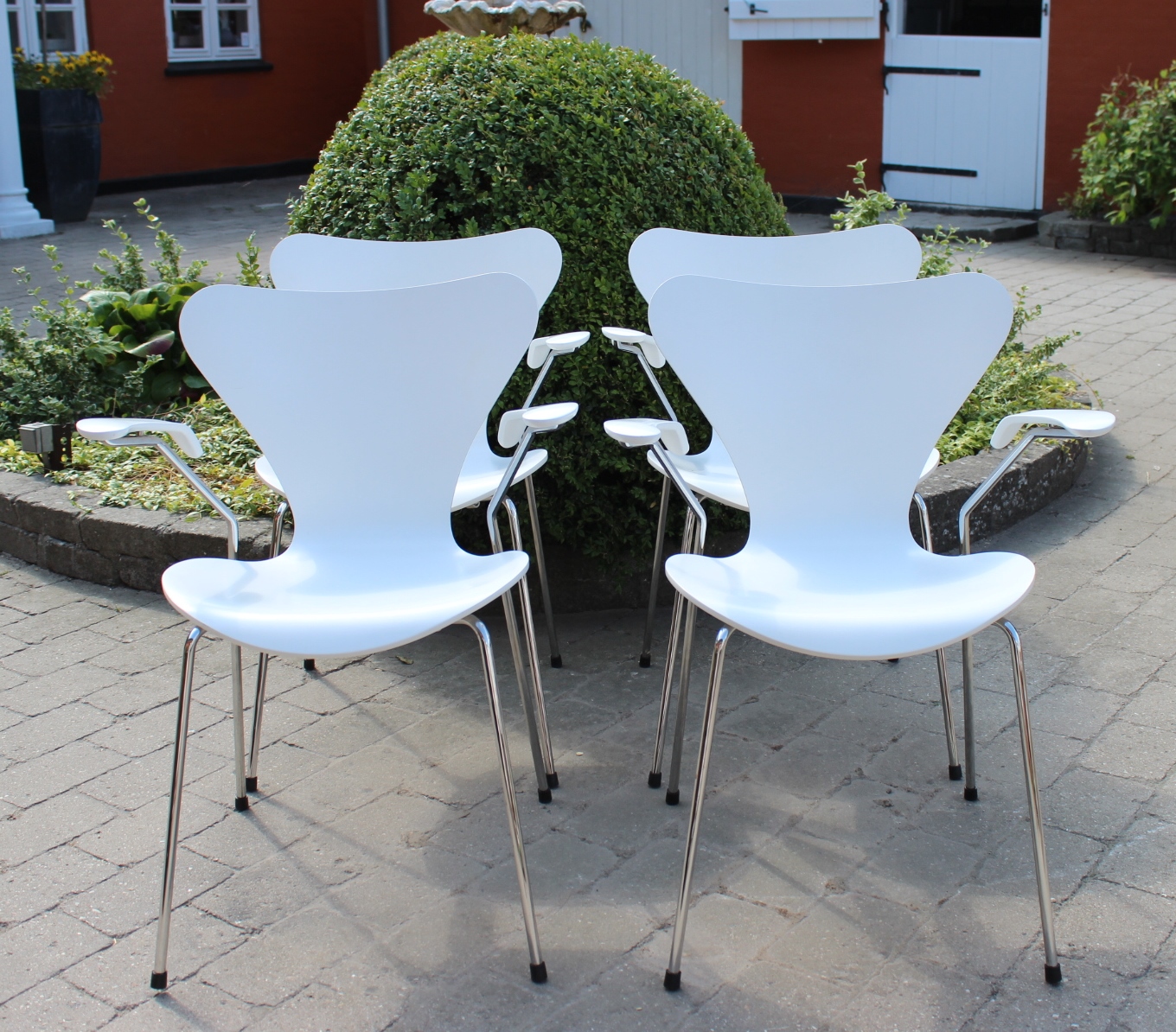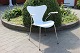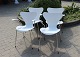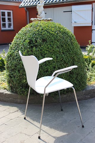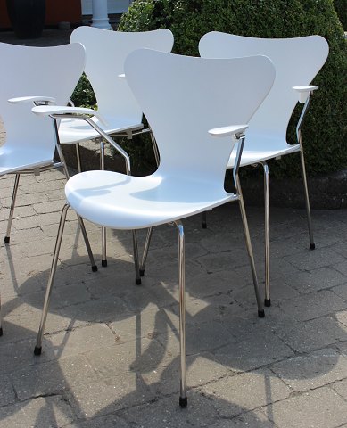 4 White seven chairs, model 3107, with armrests, designed by Arne Jacobsen and manufactured by Fritz Hansen.