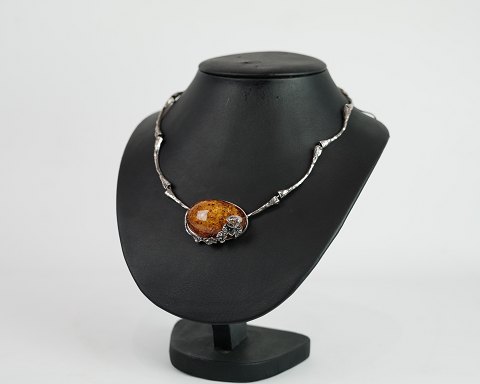 Halskæde med semi runde ferskvandsperler med hvidt slør og forgyldt lås.