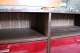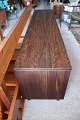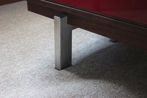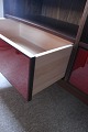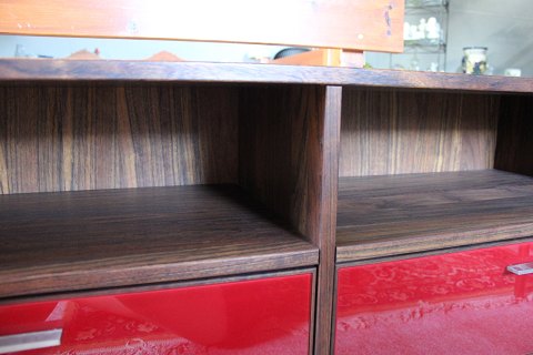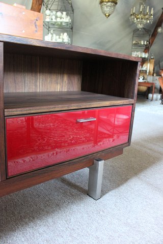 Long sideboard in walnut with drawers with red formica and metal legs.