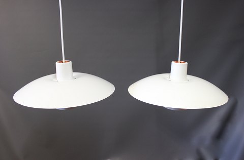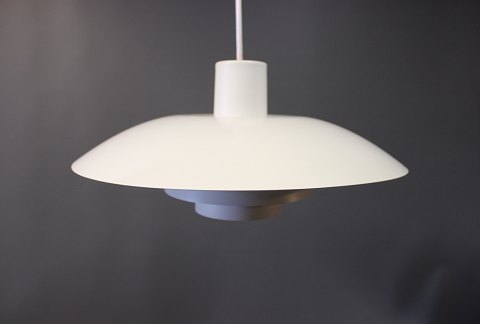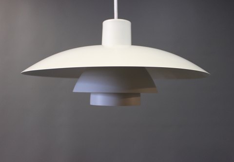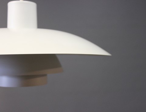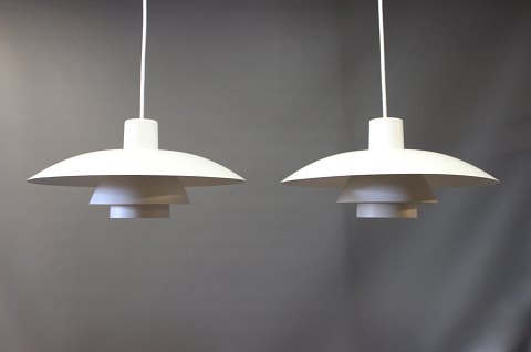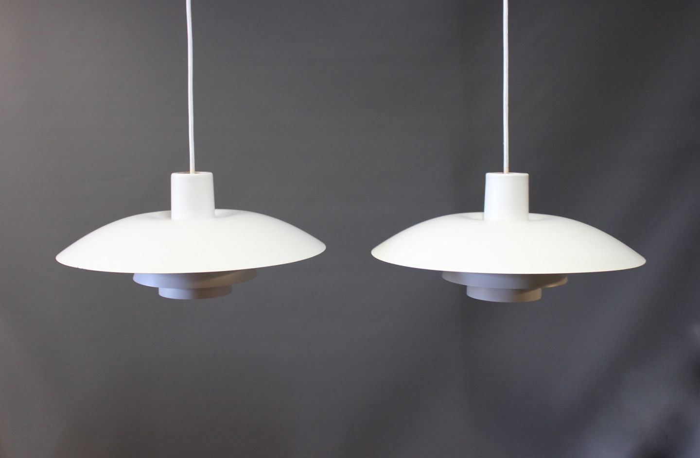 2 White PH4 pendants designed by Poul Henningsen and manufactured by Louis Poulsen.