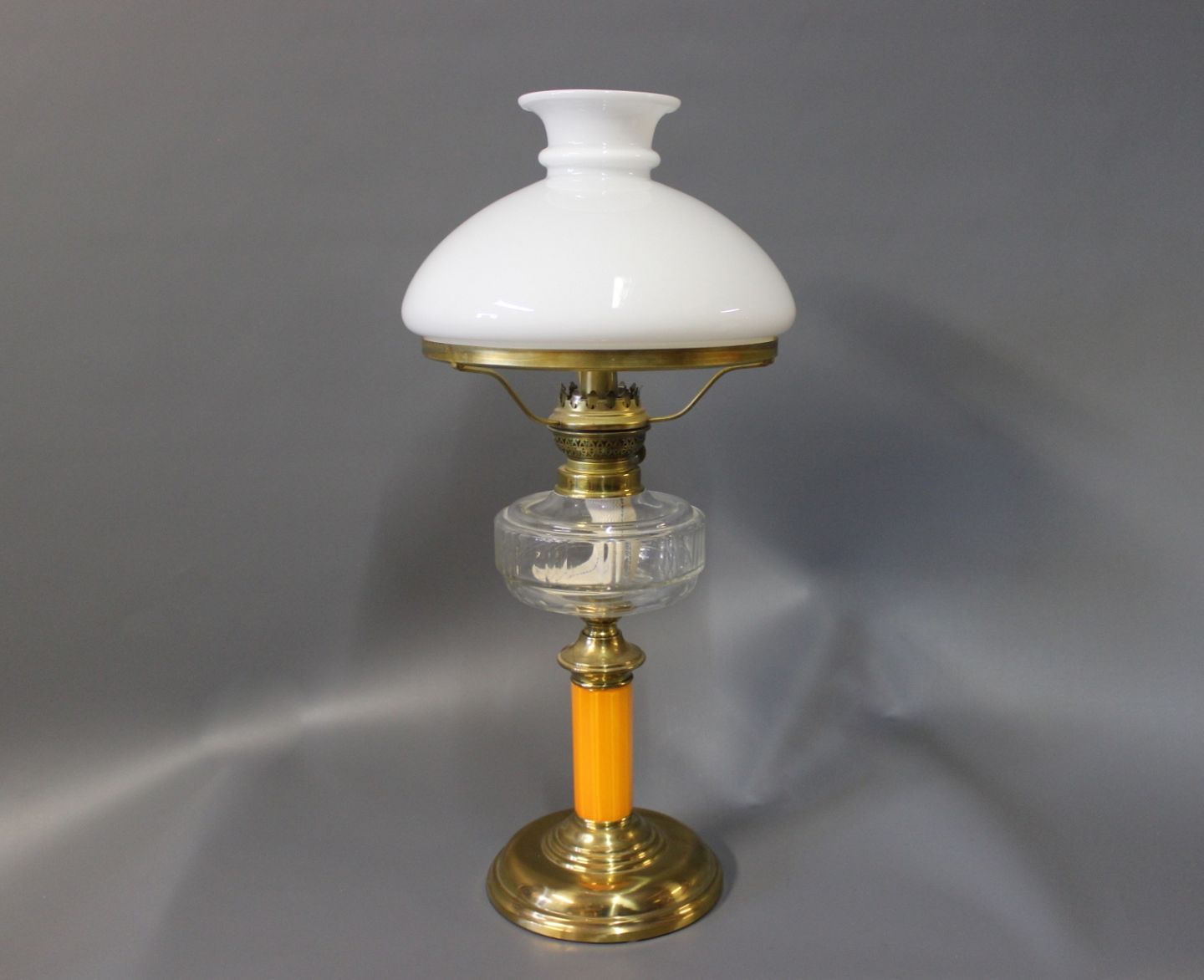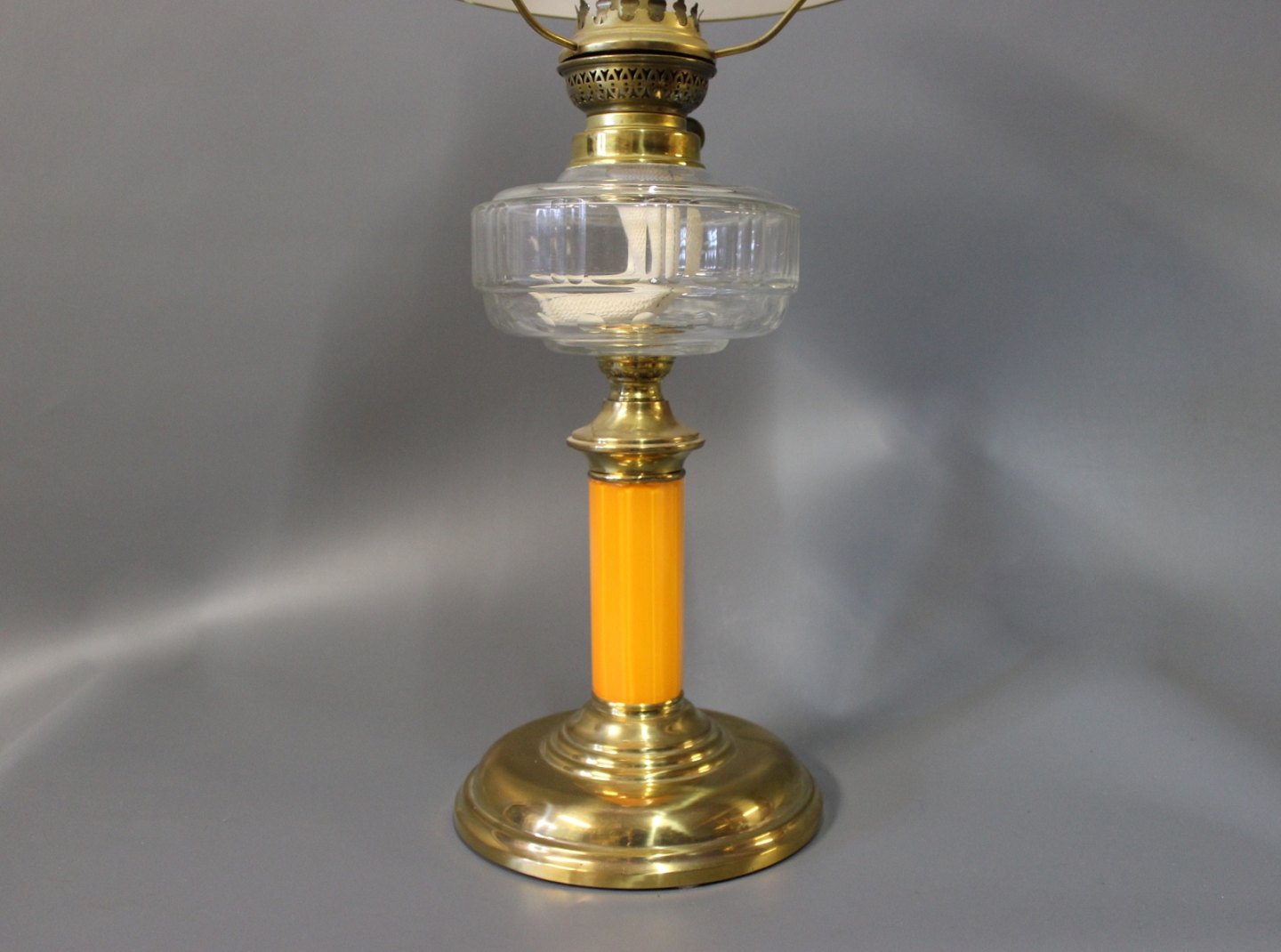 Kerosene table lamp with orange glass stem and brass foot from around the year 1880.