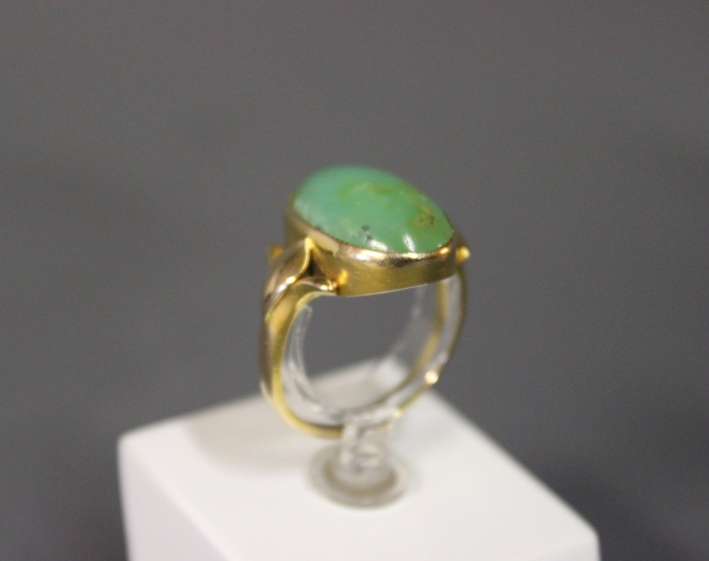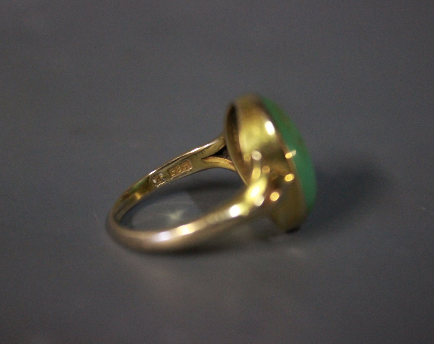 14 kt. guldring med cabouchonsleben grøn sten.