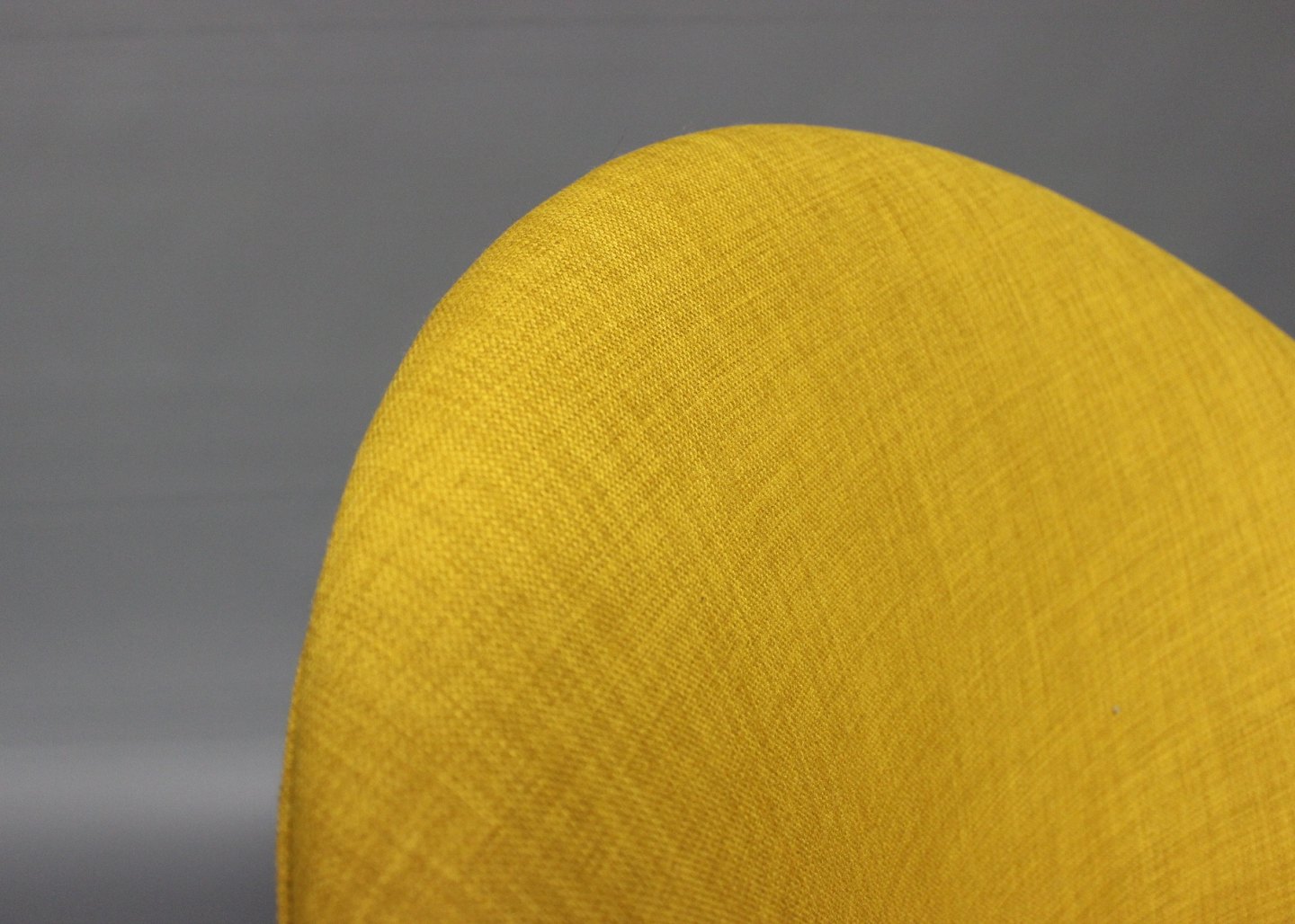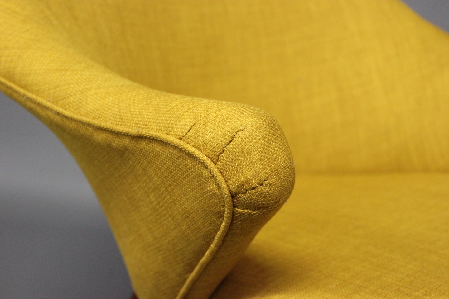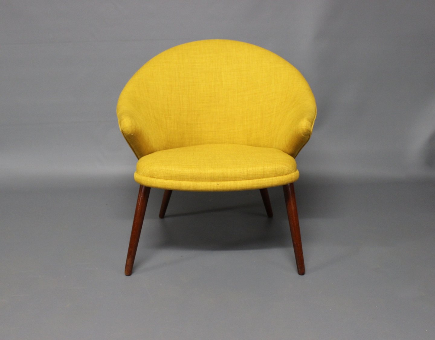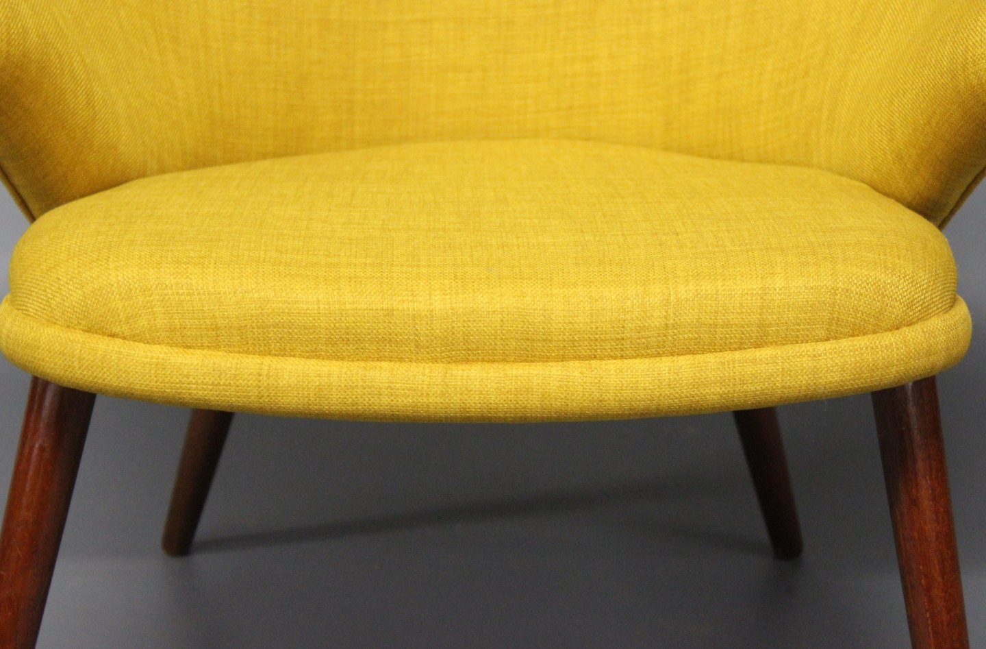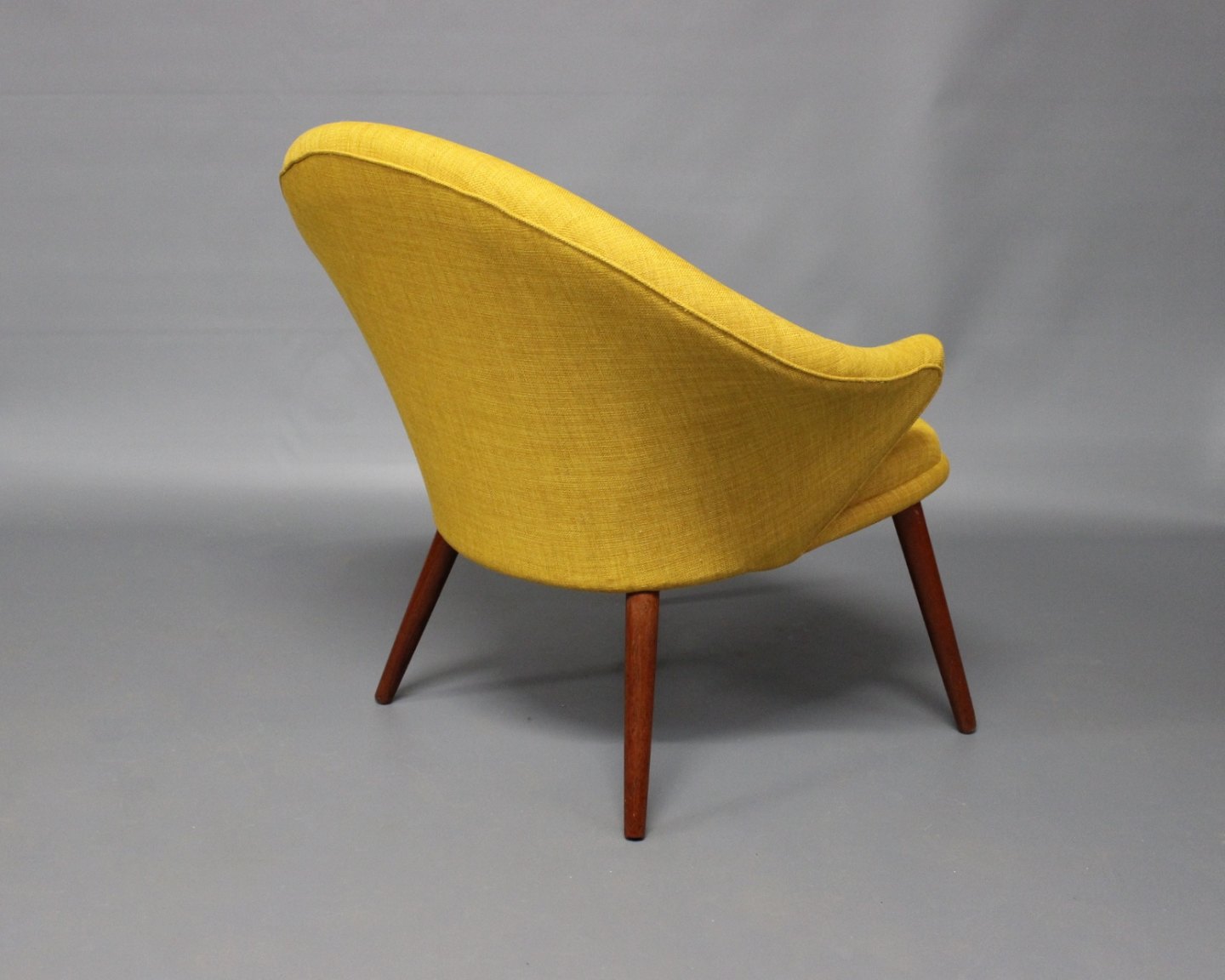 SoldNanna Ditzel armchair upholstered in yellow fabric and legs of teak. The chair was manufactured in Denmark in the 1960s.