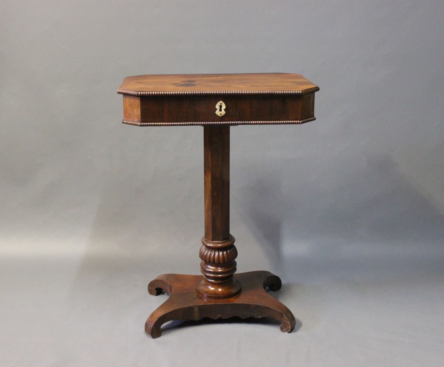 Lille antikt sybord i palisander med drejefunktion og fine detaljer. Bordet fremstår med en del patina og er fra mellem 1840 og 1860.