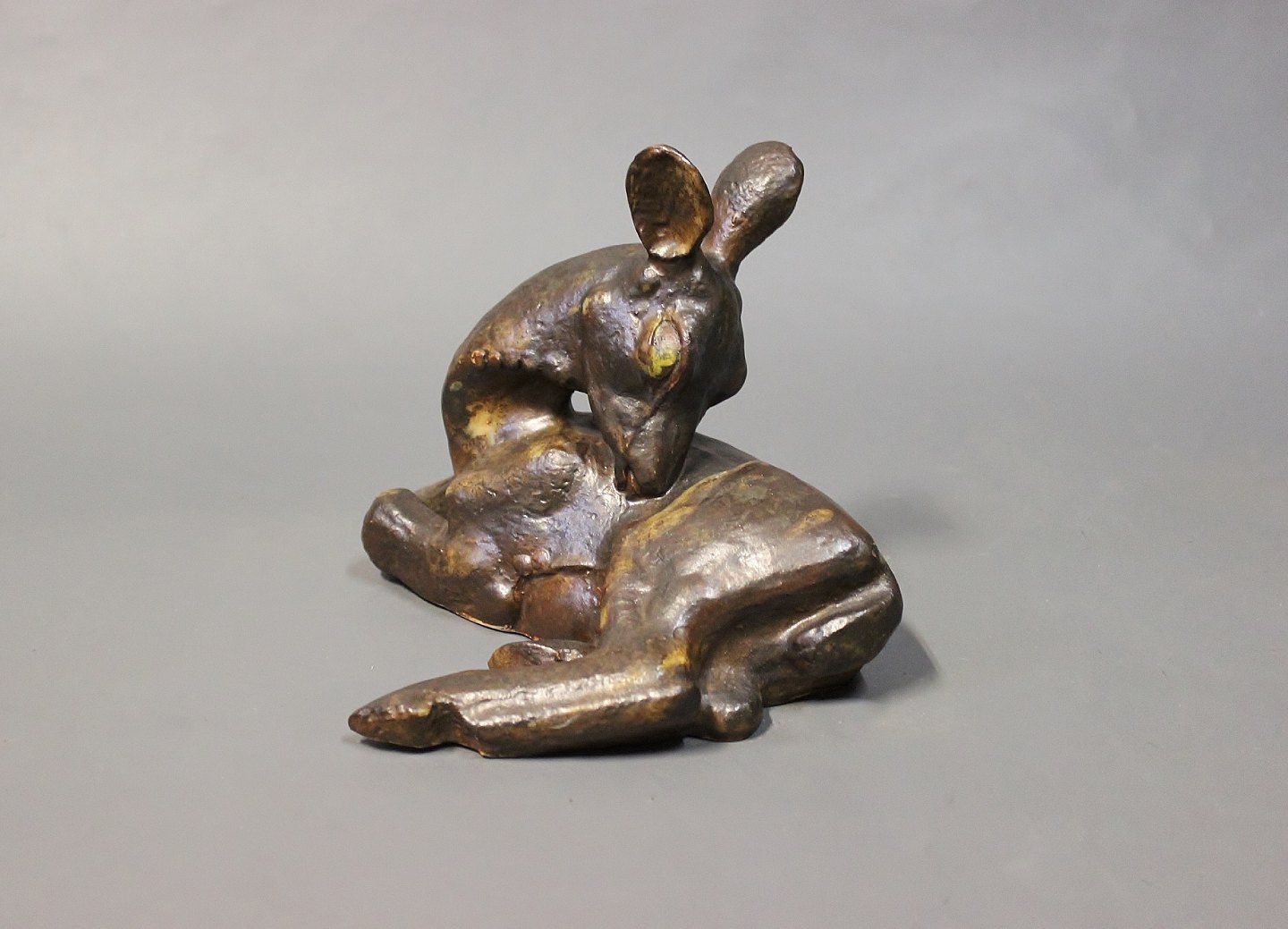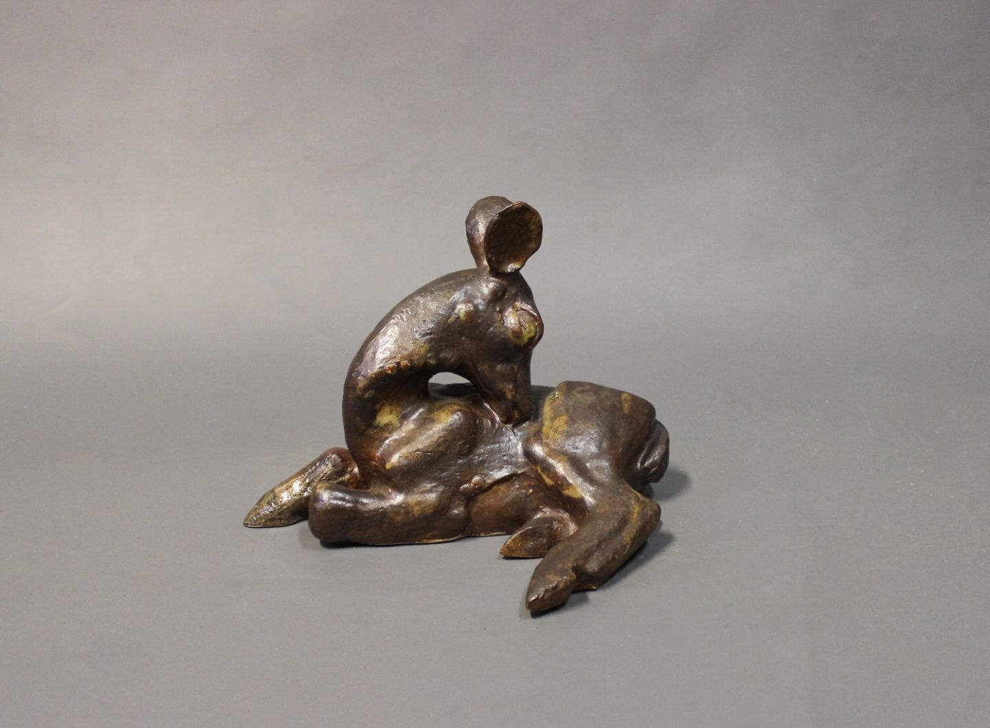 Dark brown ceramic figure, laying deer, no.: 161 by Arne Bang and manufactured at Copenhagens Stoneware Factory in 1929.