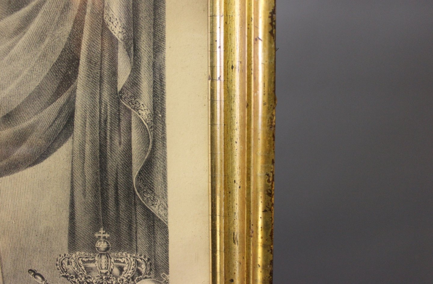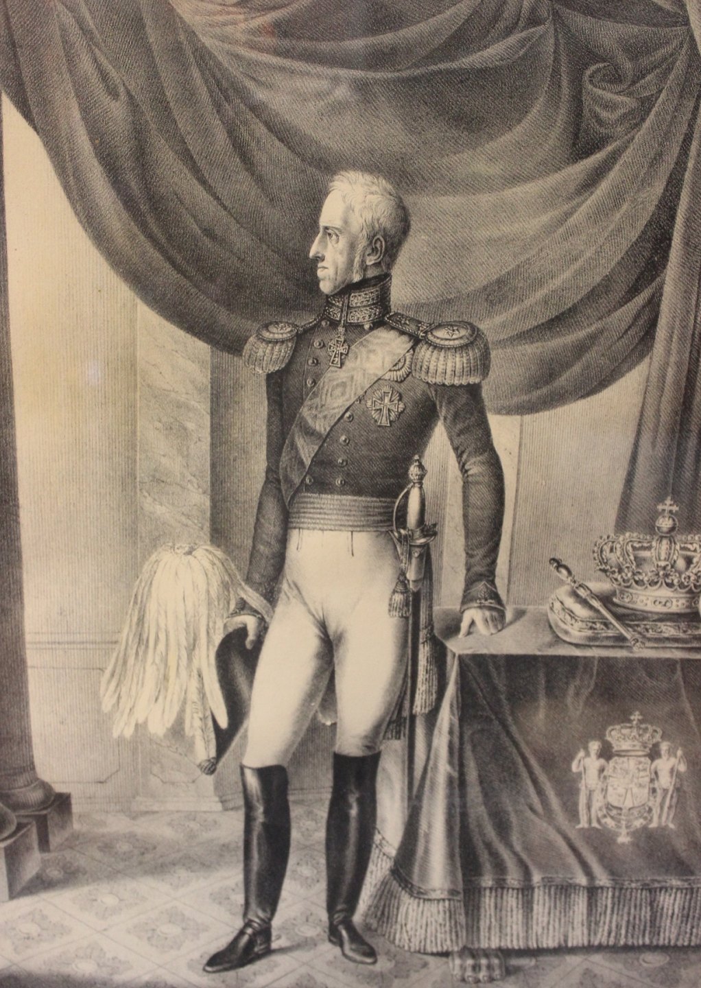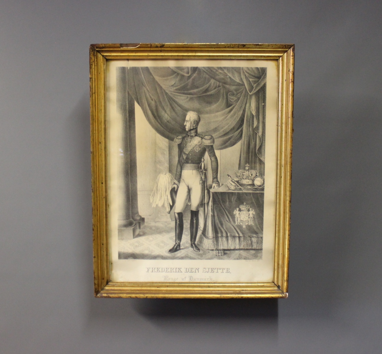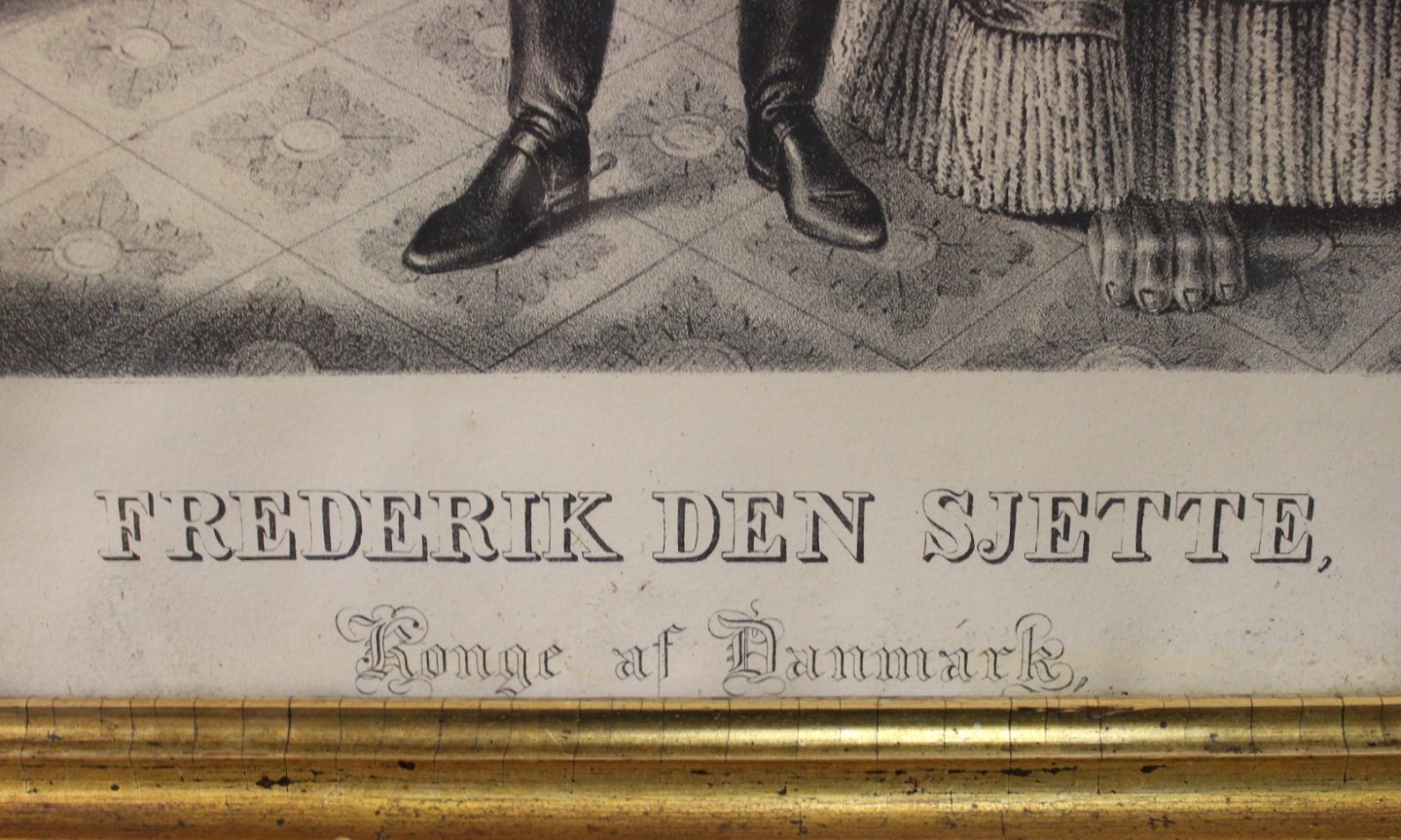 SoldLithographic in patinated gilded frame with motif of Frederik the 6th, King of Denmark. Signed F. Schepelern and from 1830.