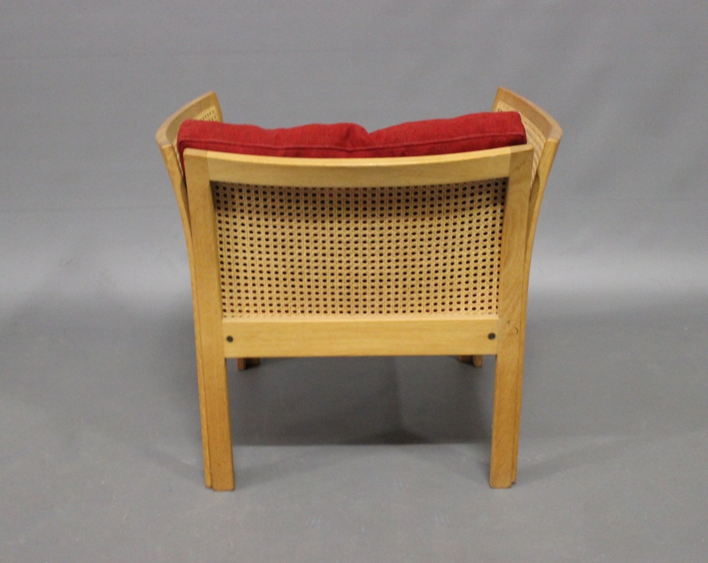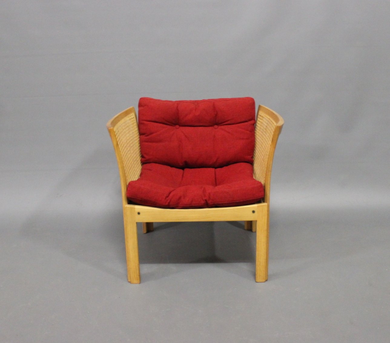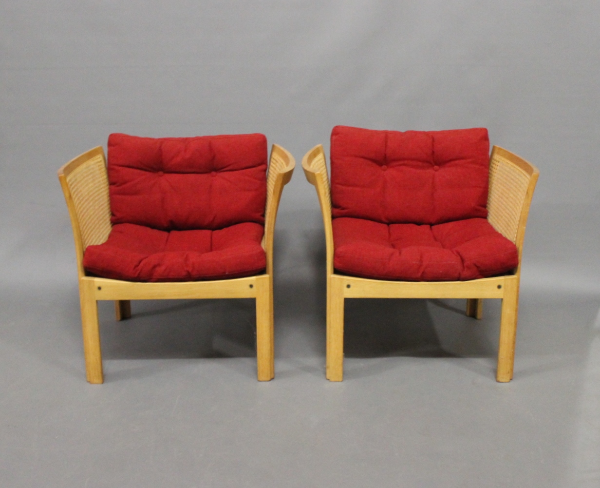 A pair of easy chairs in oak designed by Rud Thygesen and Johnny Sørensen, manufactured by Silkeborg furniture factory in the 1960s.
