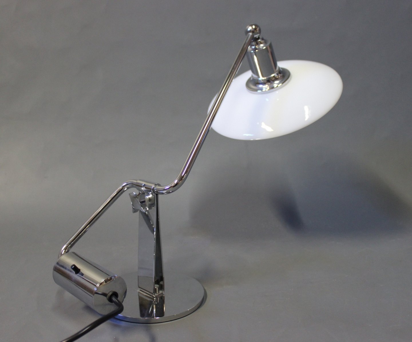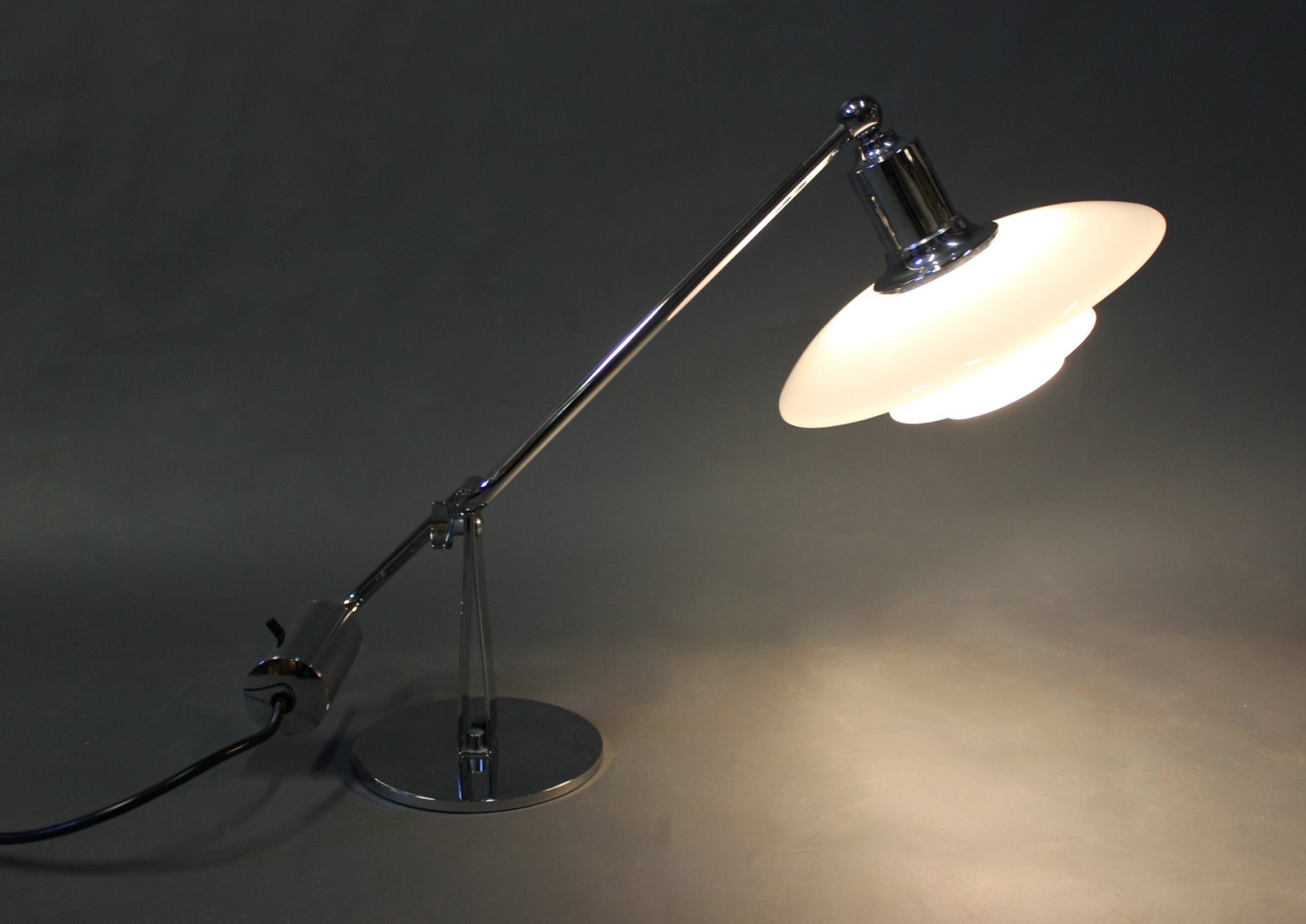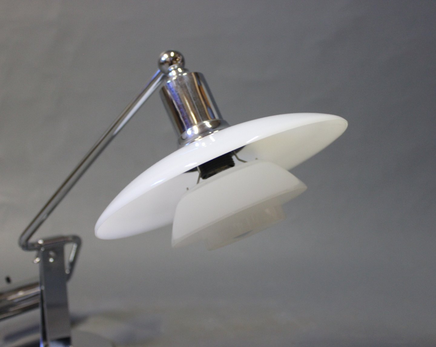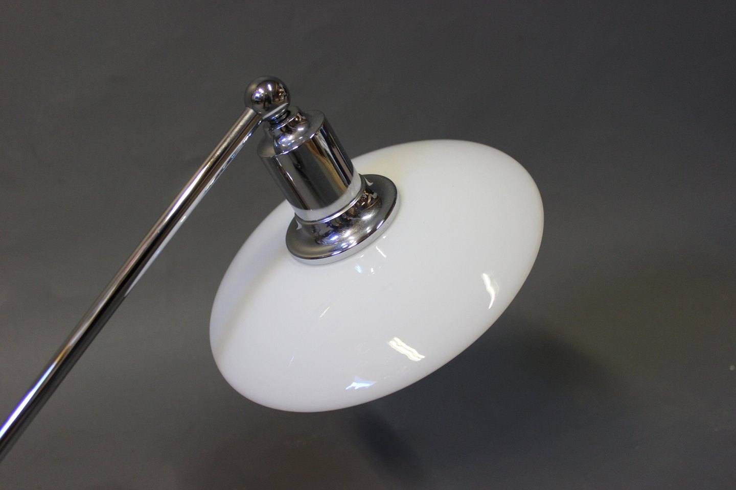 Piano lamp PH 2/1 designed by Poul Henningsen in 1943 and manufactured by Louis Poulsen in the 1980s. The Shades are of White opaline glass and the frame of chrome plated metal.