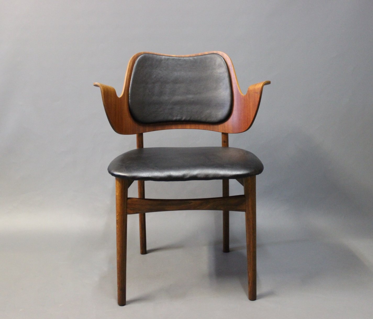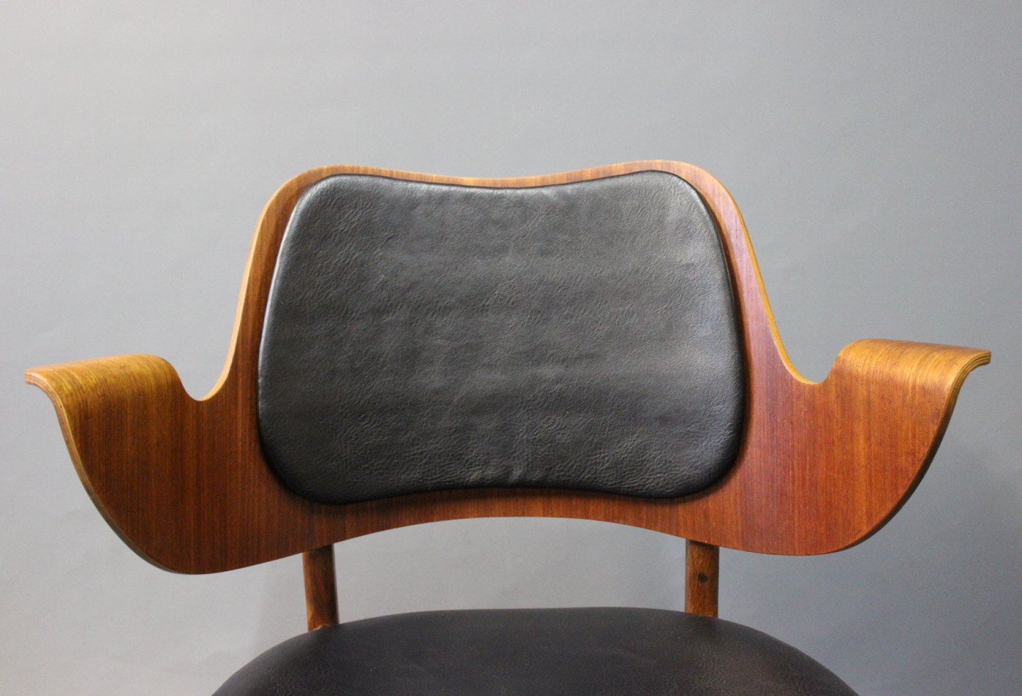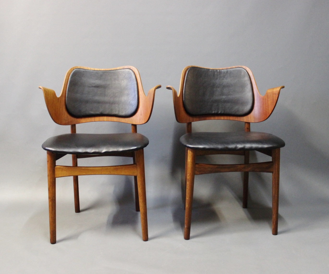 SoldA pair of armchairs designed by Arne Hovmand Olsen in teak and upholstered in black classic leather of Danish Design from the 1960s.