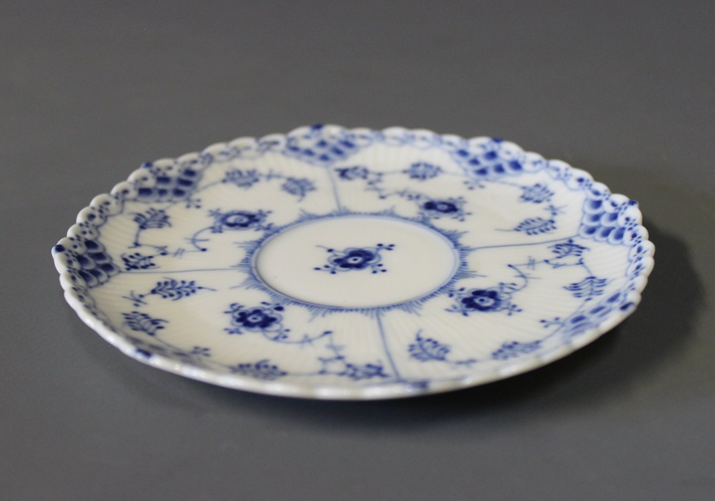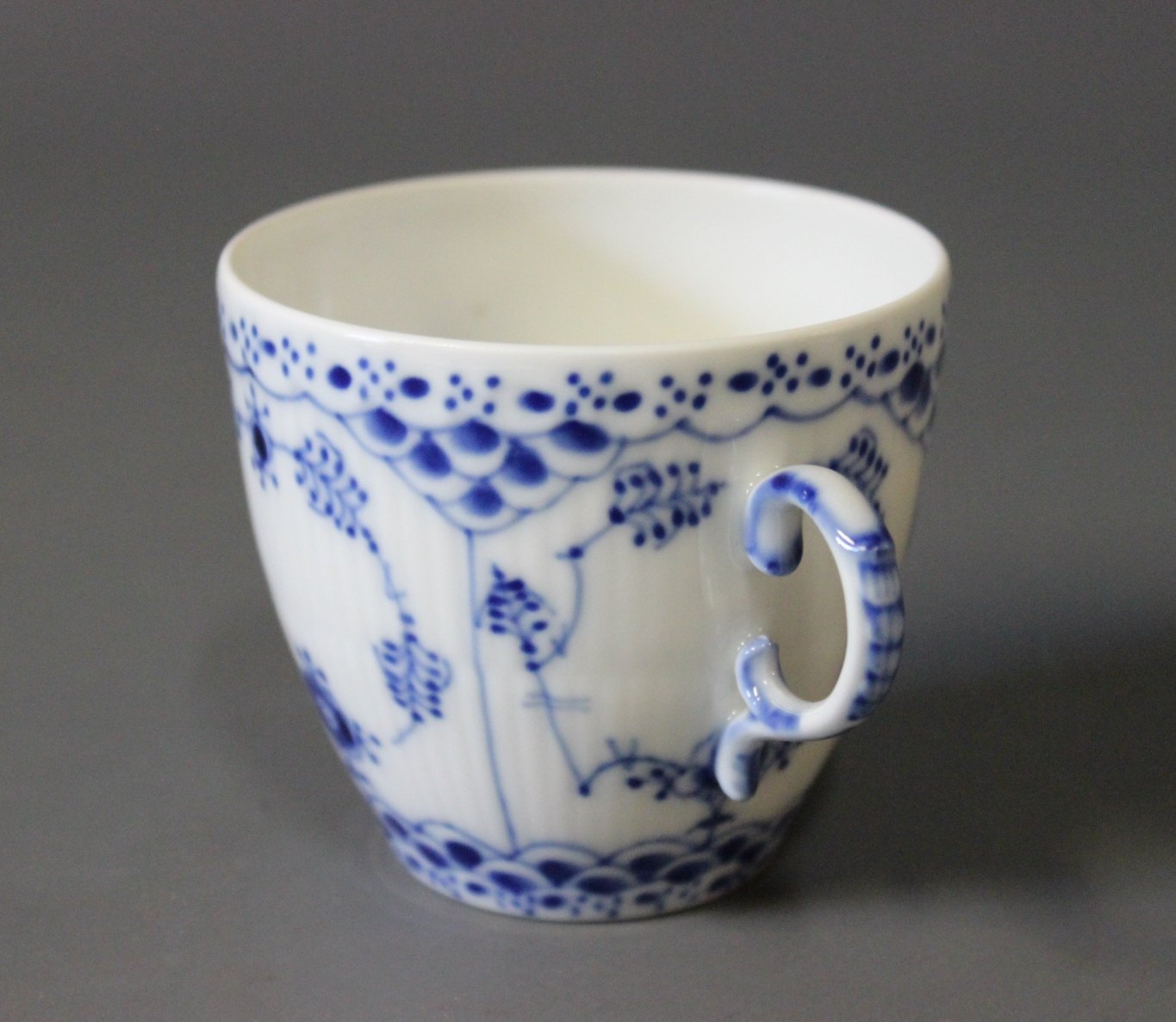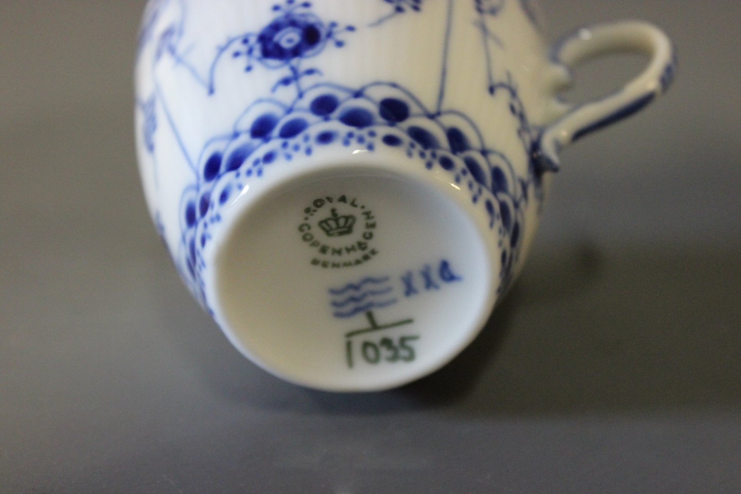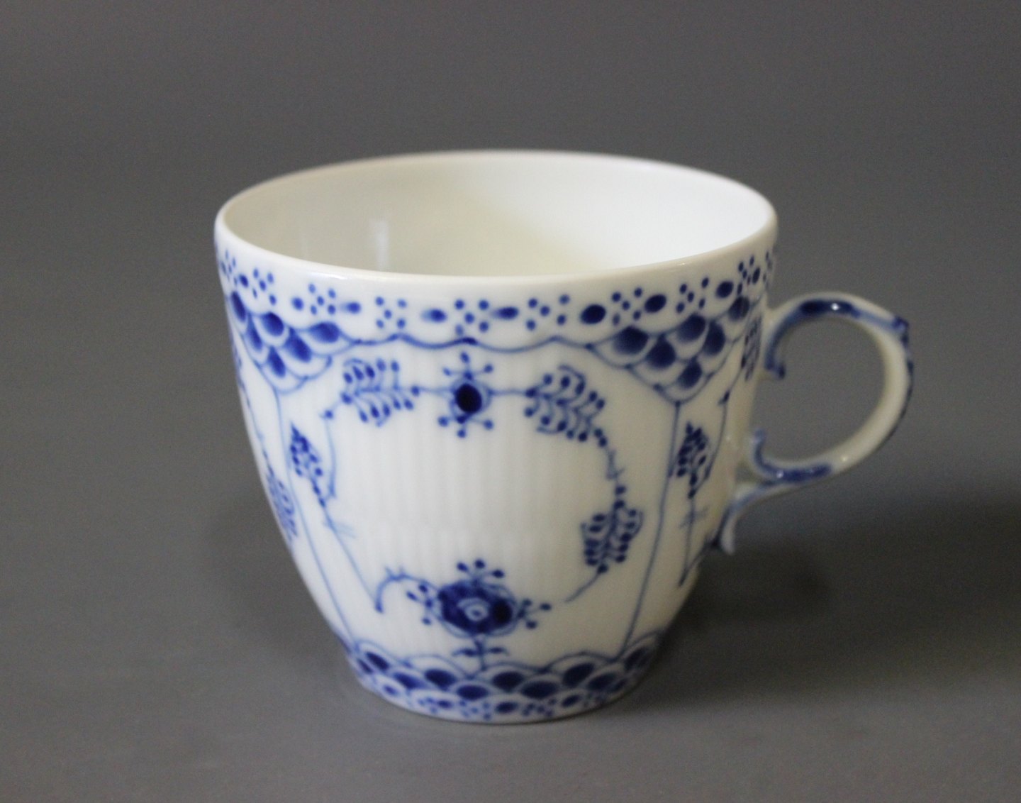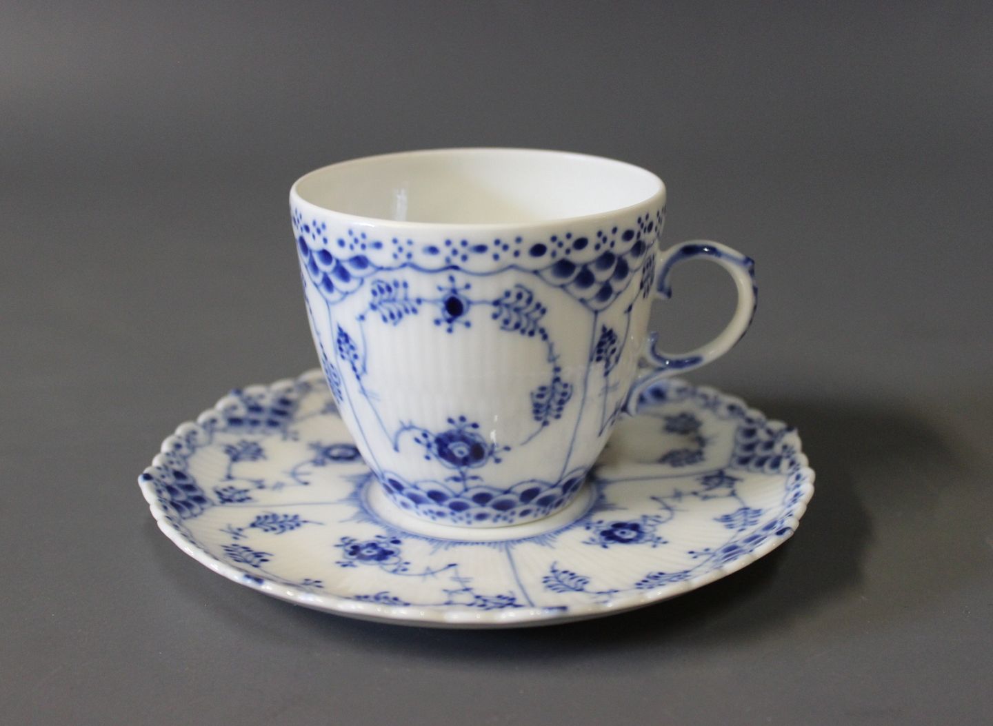 Royal Copenhagen blue fluted lace coffeecup with saucer, no.: 1/1035.