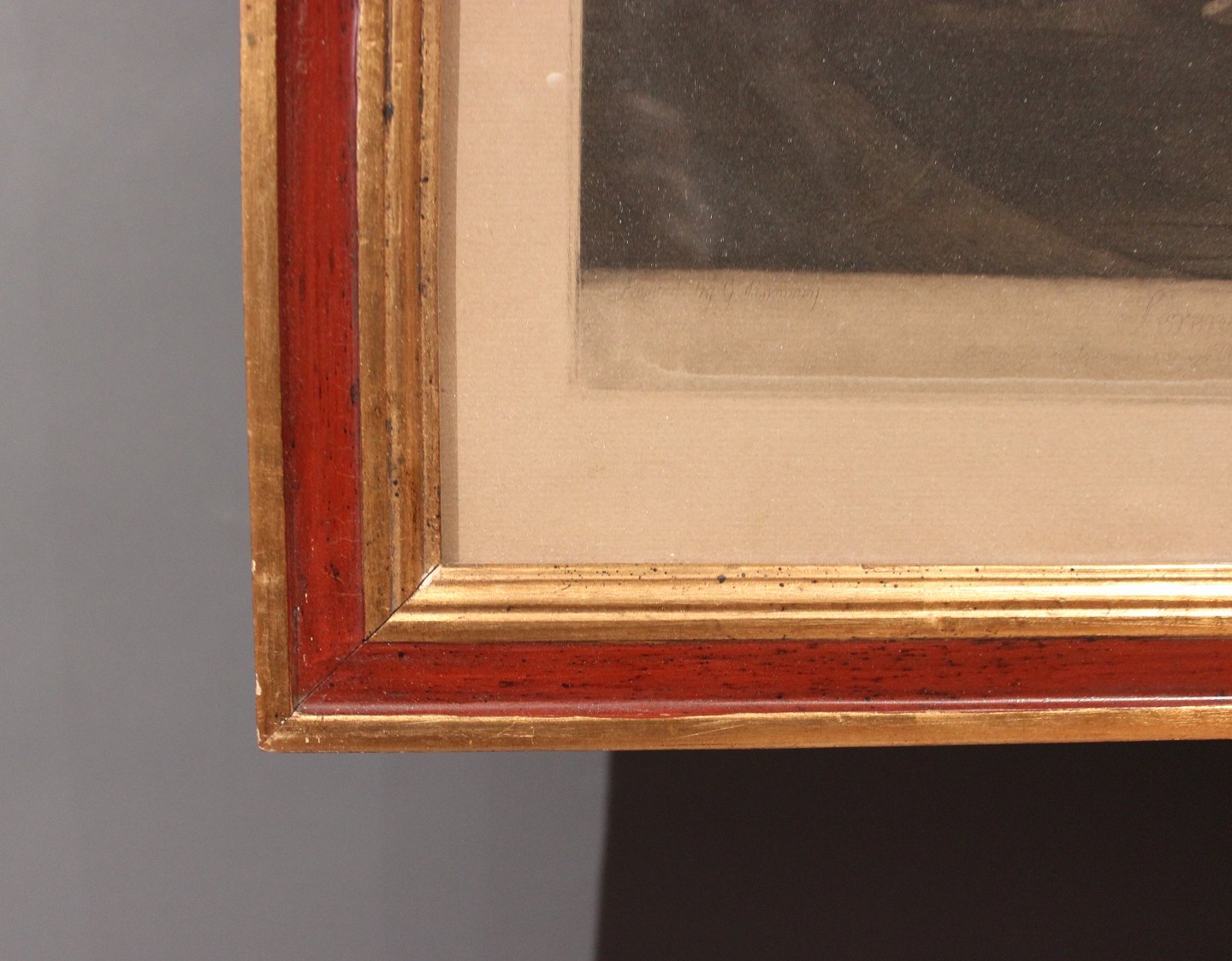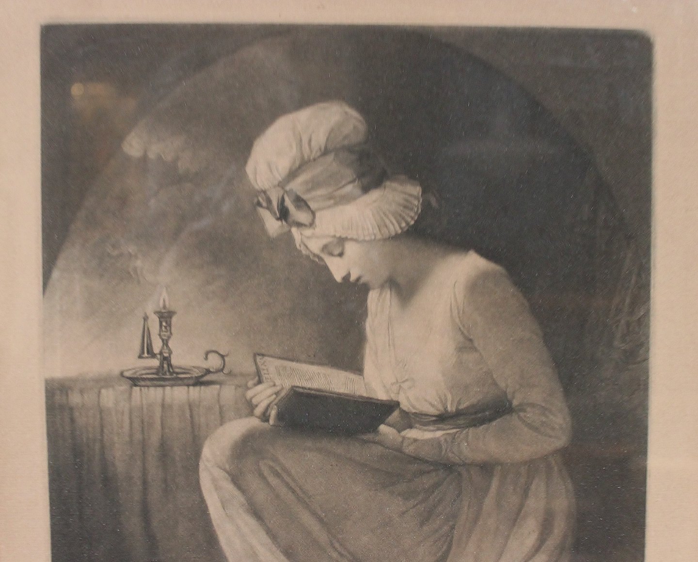 Kobberstik med motiv af læsende dame med fin gylden og brun ramme.