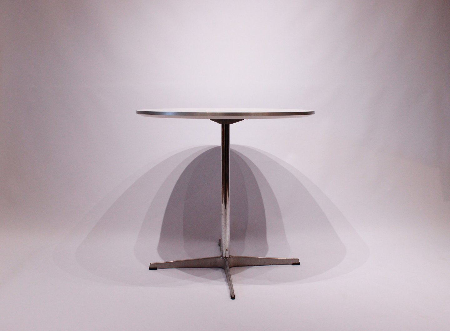 SoldRound Café table of white laminate tabletop with aluminum edge designed by Piet Hein and Arne Jacobsen and manufactured by Fritz Hansen in 2008.