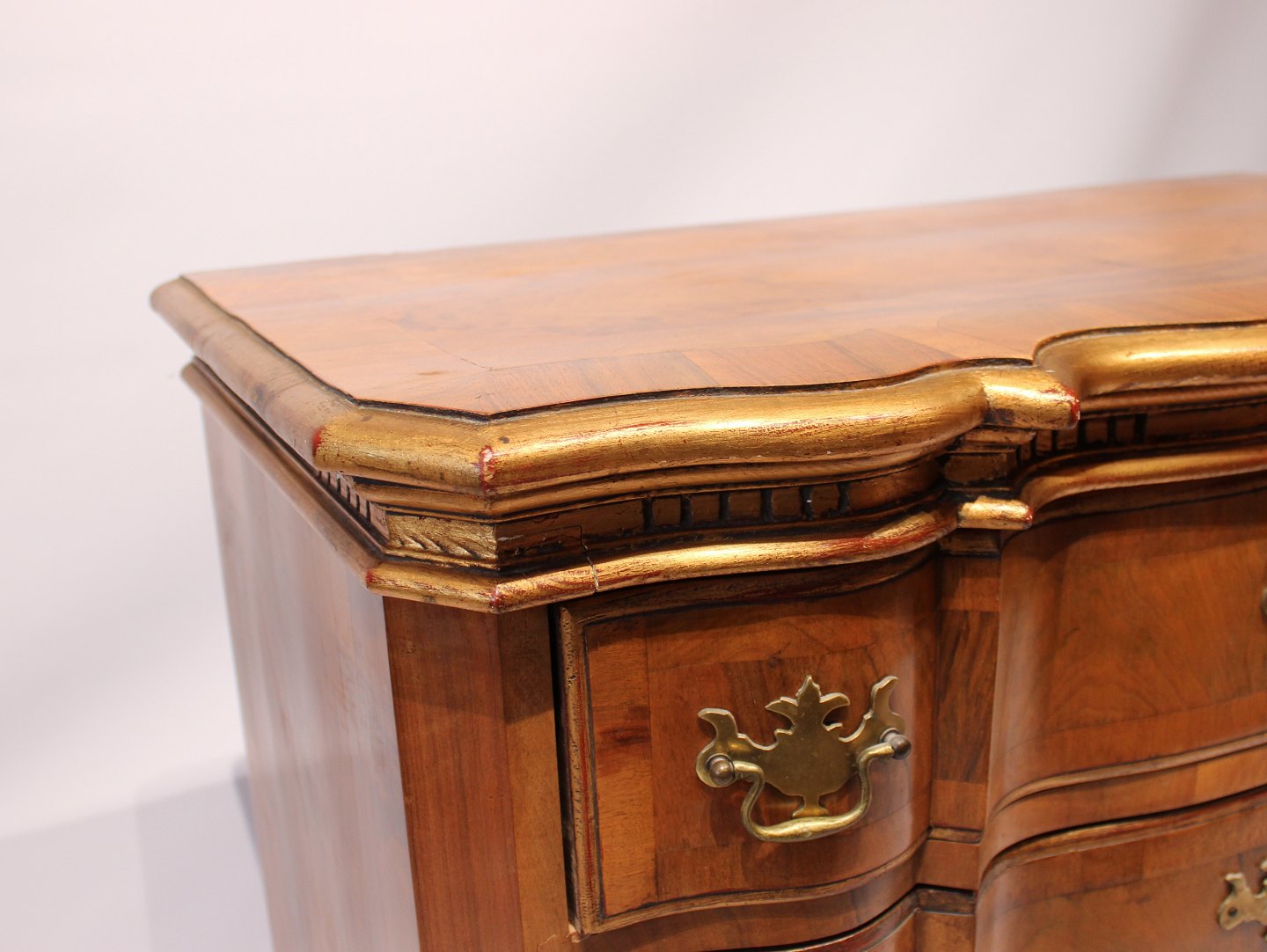 SoldRococo chest of drawers in walnut decorated with gold leaf from Denmark from the 1880s. The chest is in great vintage condition.