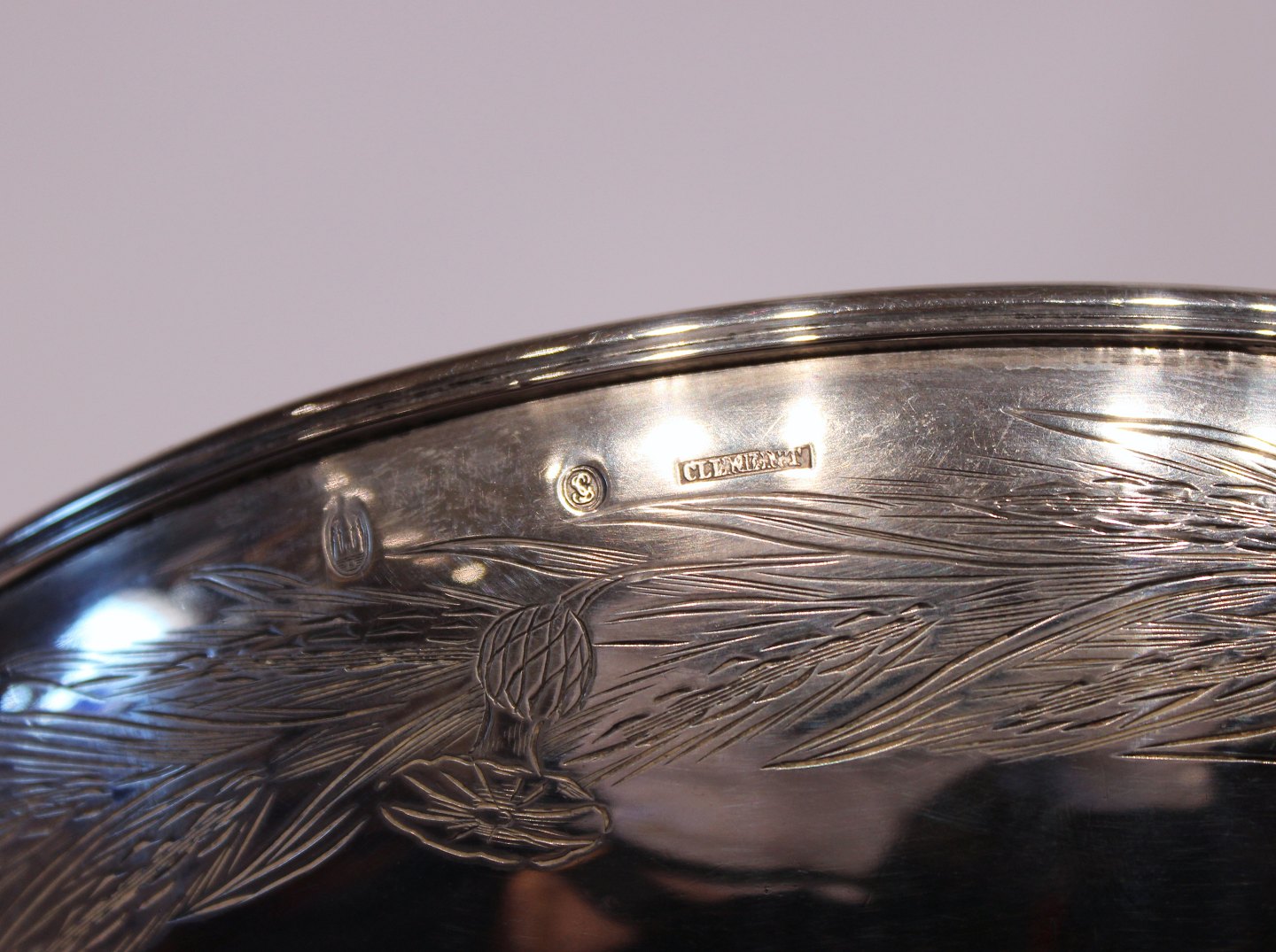 Stor opsats af tretårnet sølv dekoreret med blomster og bier på siden, stemplet Clement.