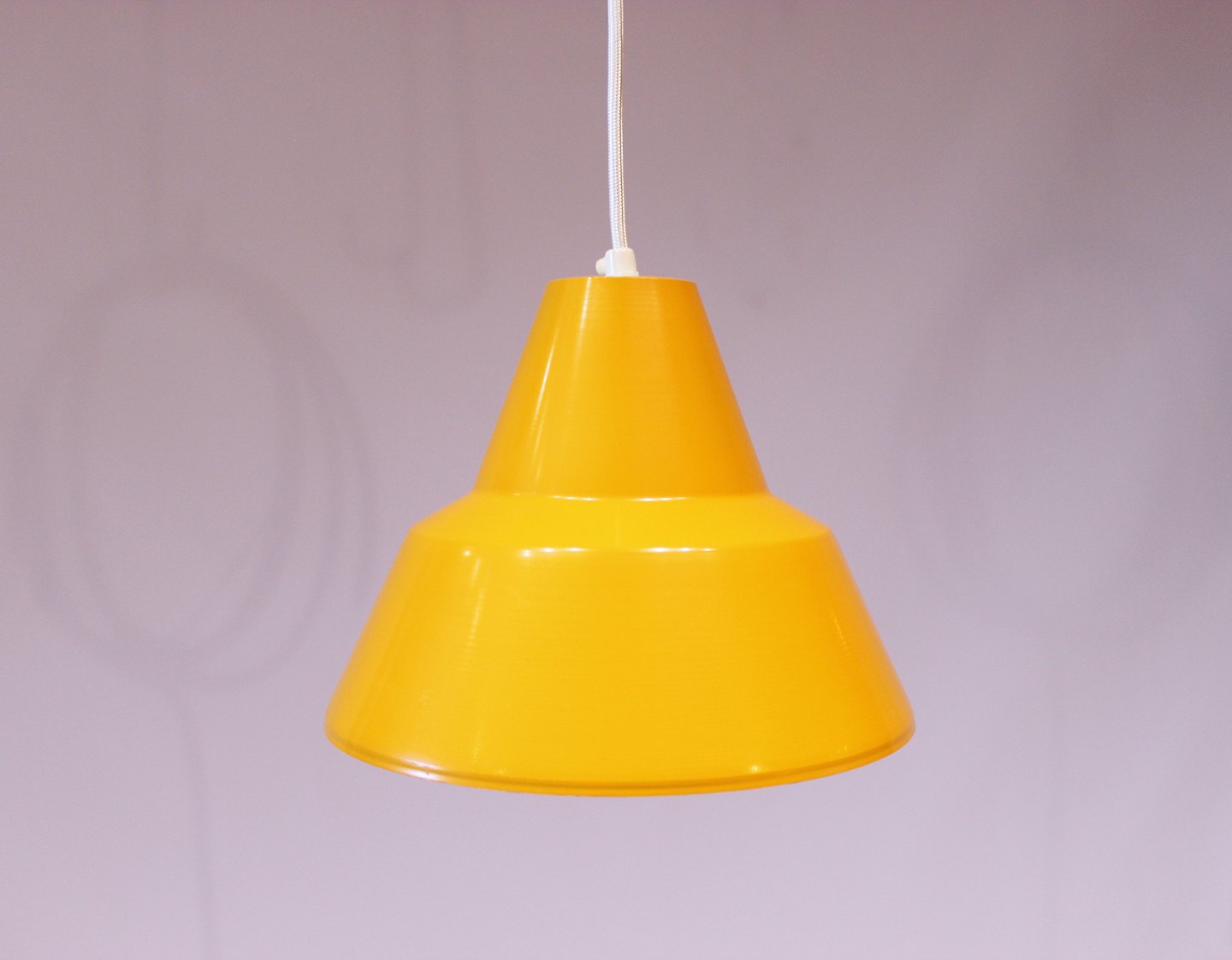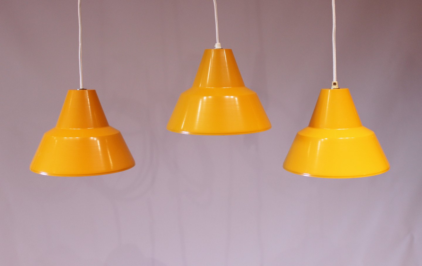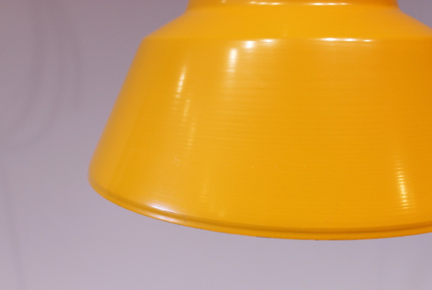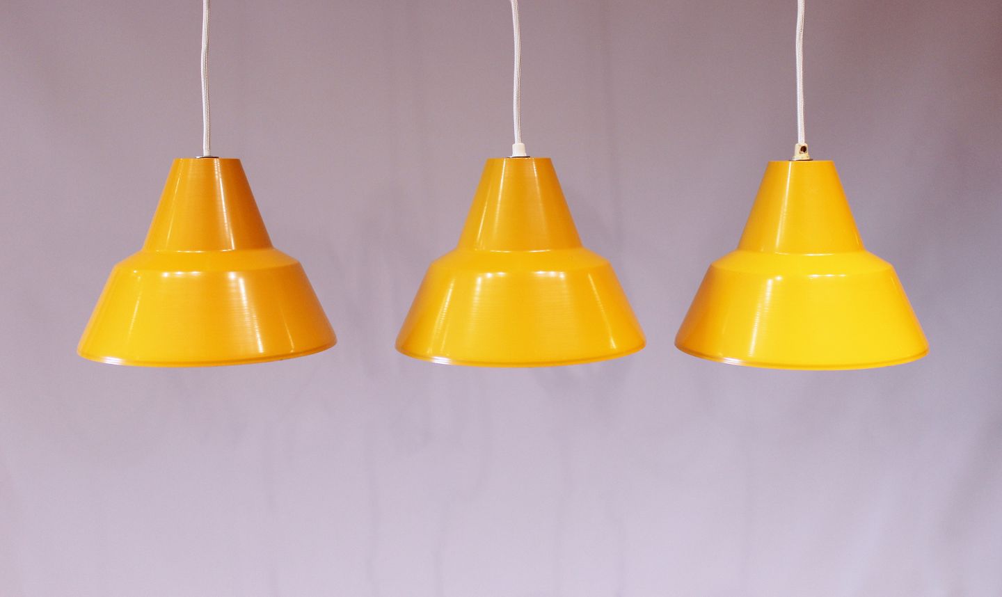 SoldSet of 3 yellow workhop pendants of danish design from the 1960s.