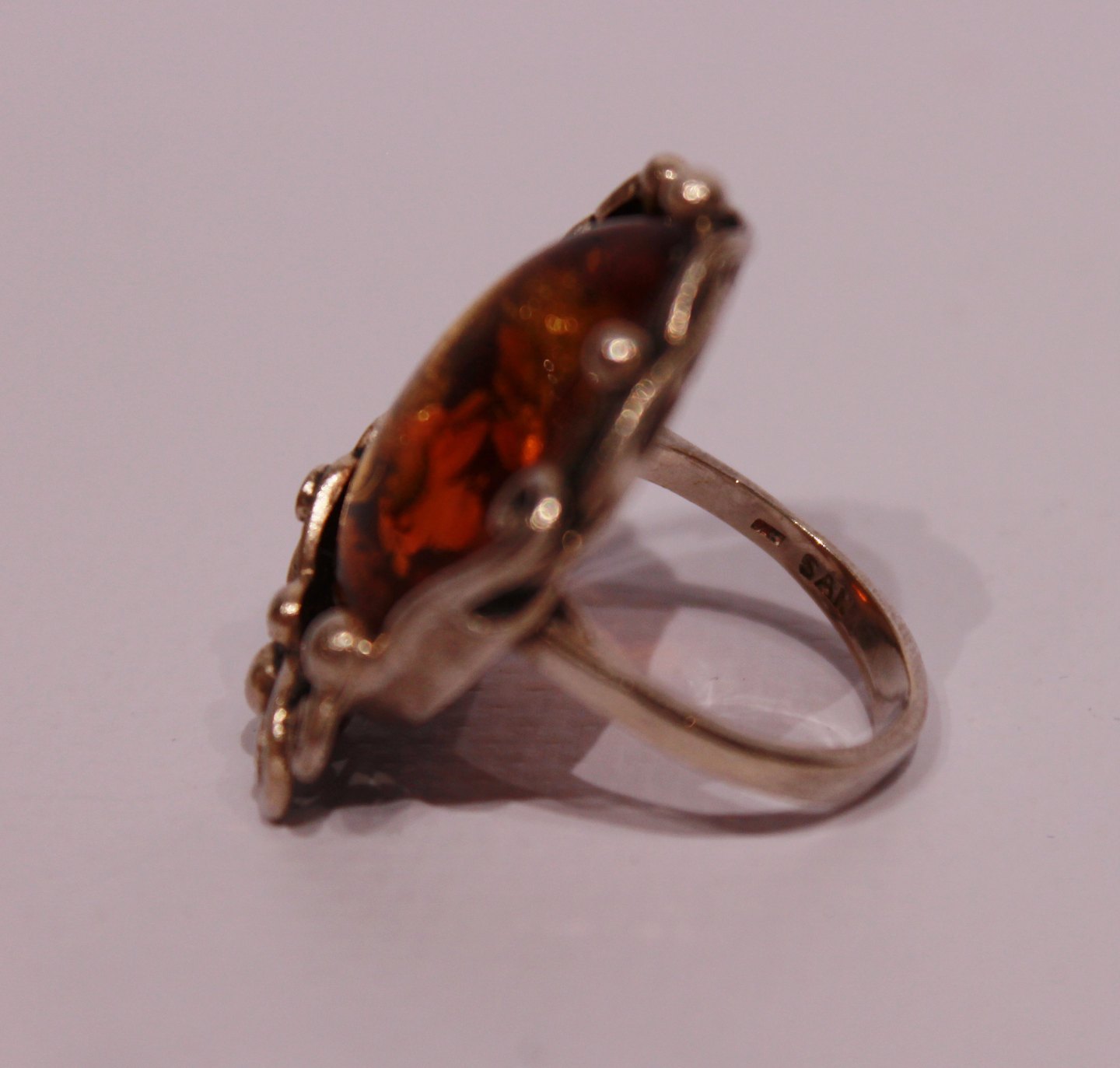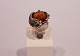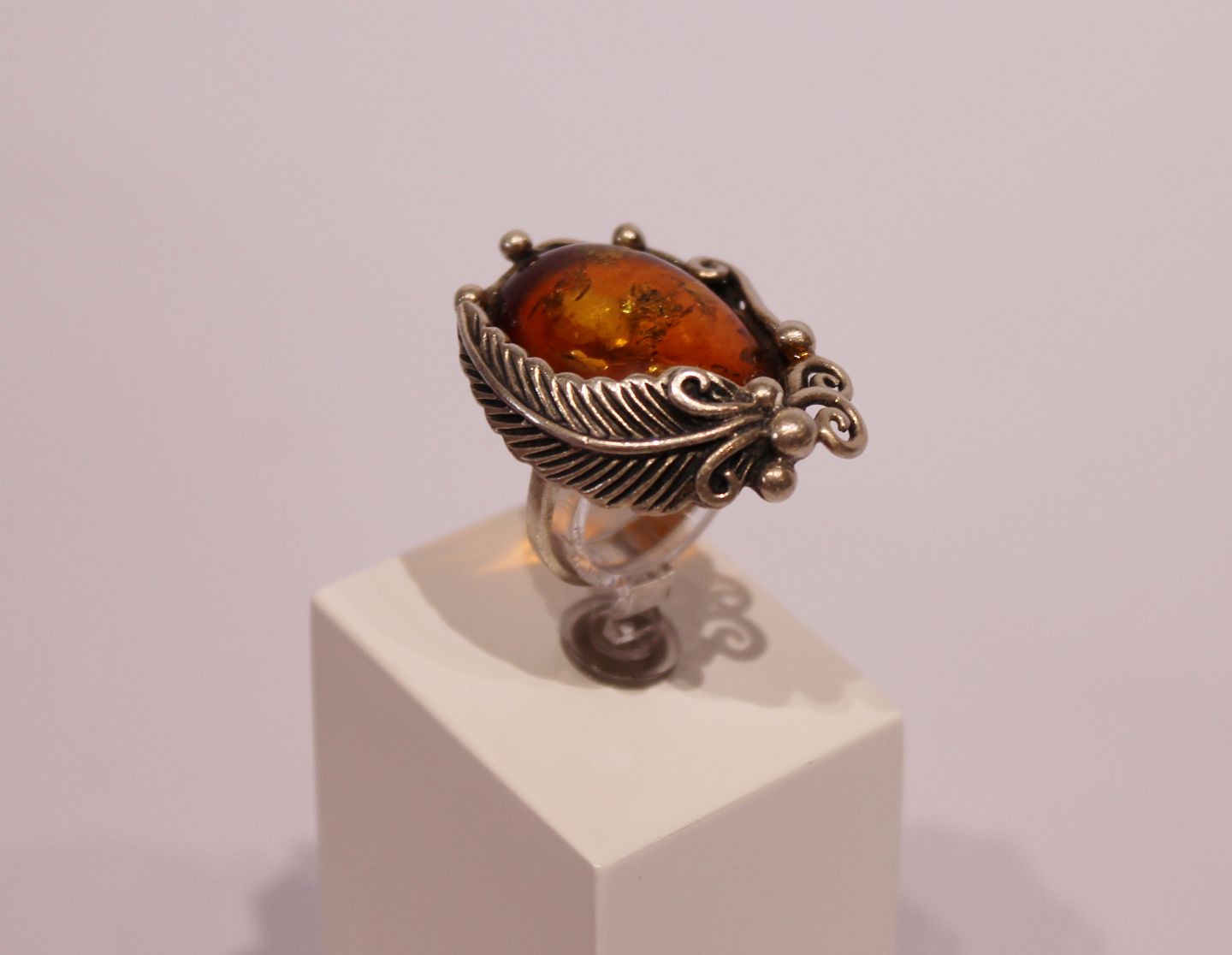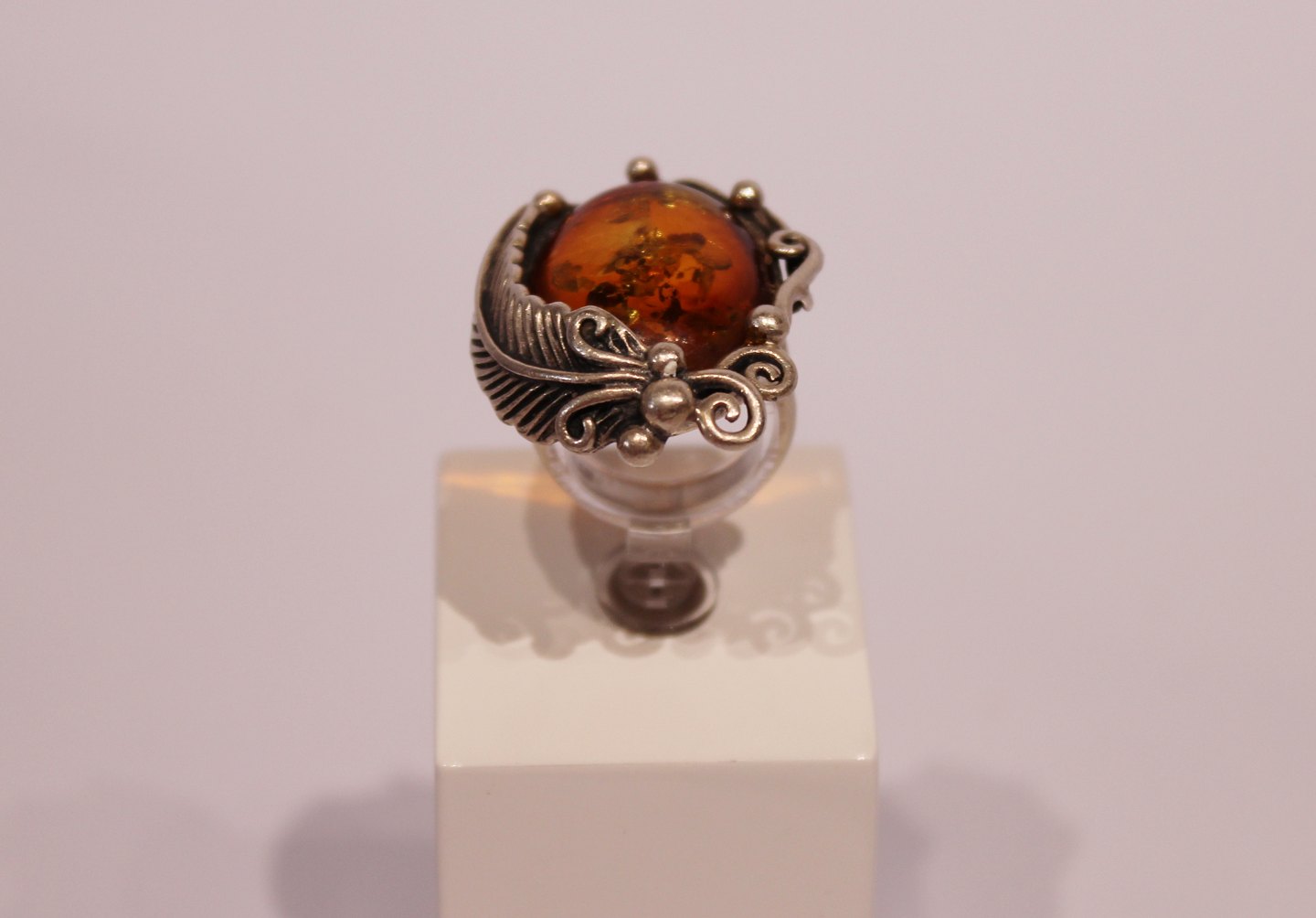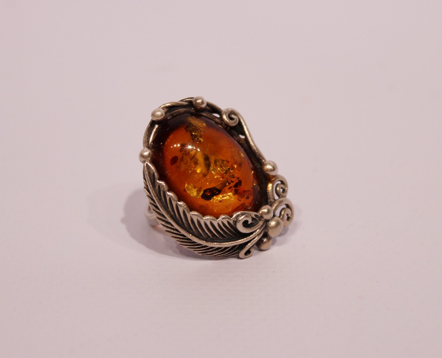 Ring med stor rav klump dekoreret med fjer i 925 sterling sølv og stemplet SAN.