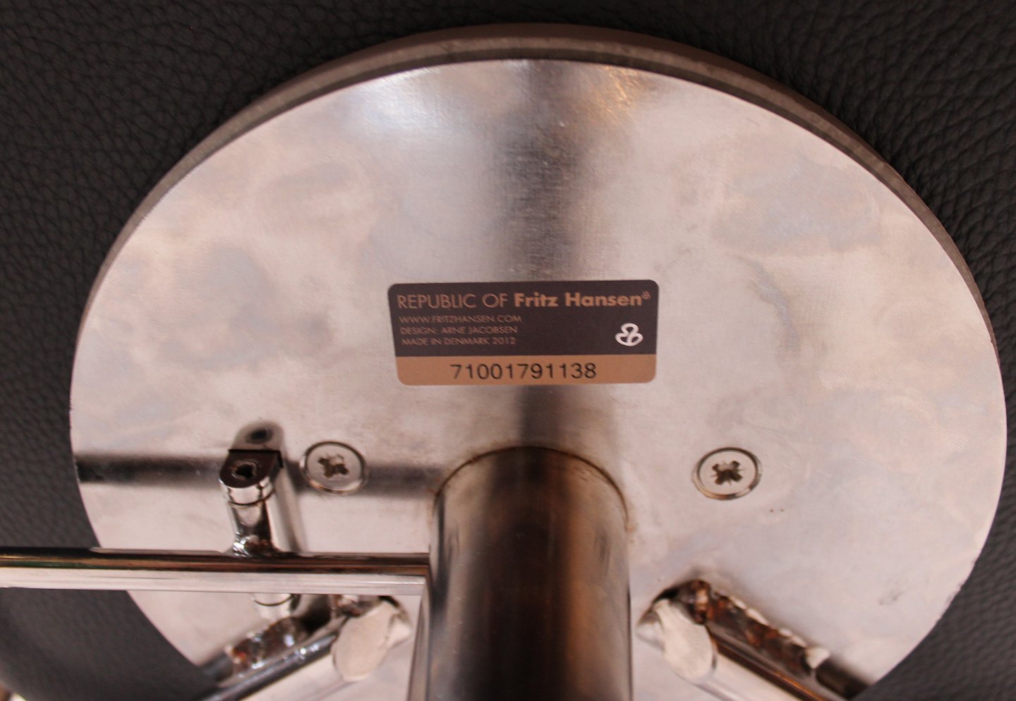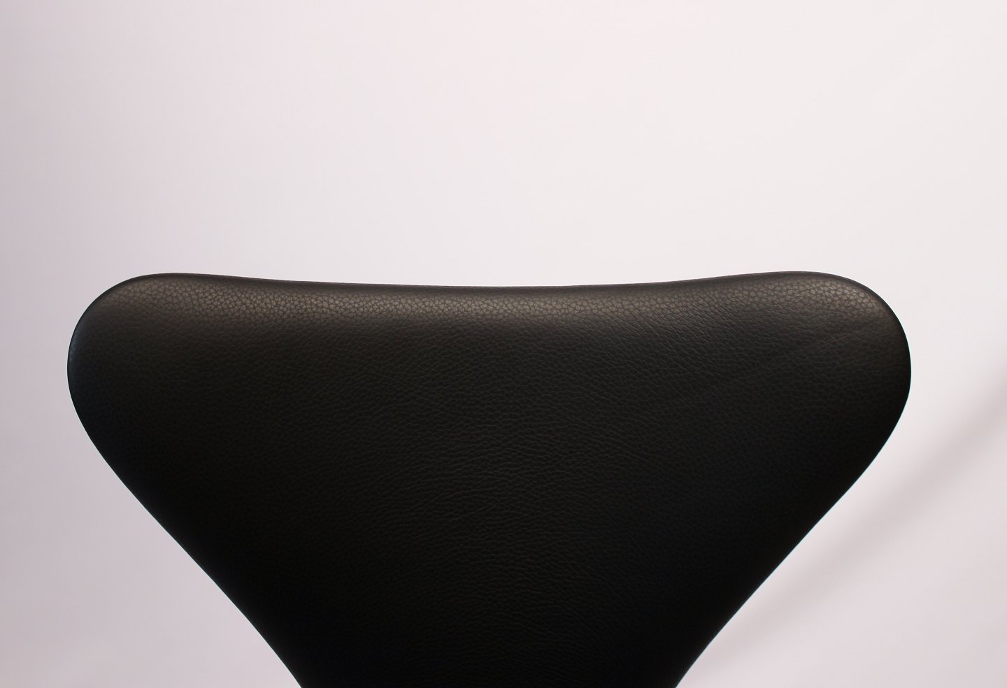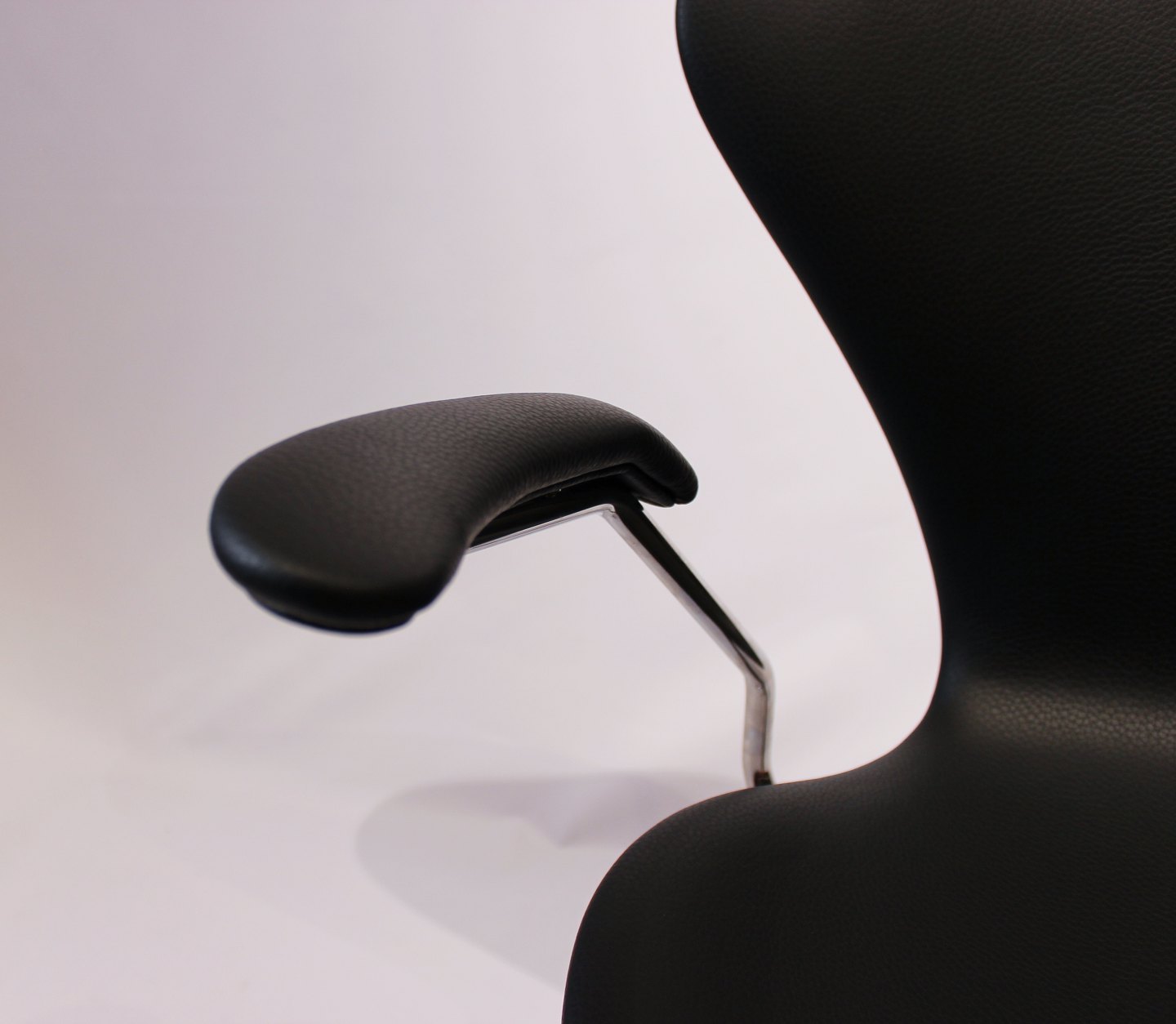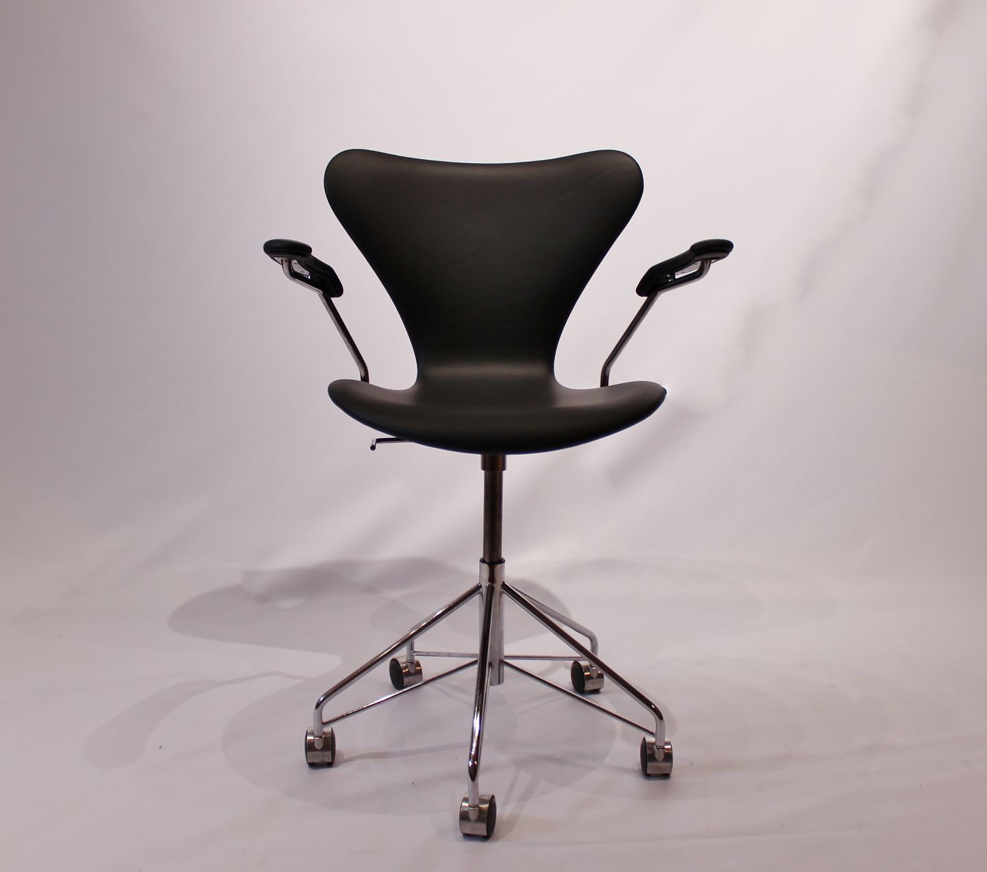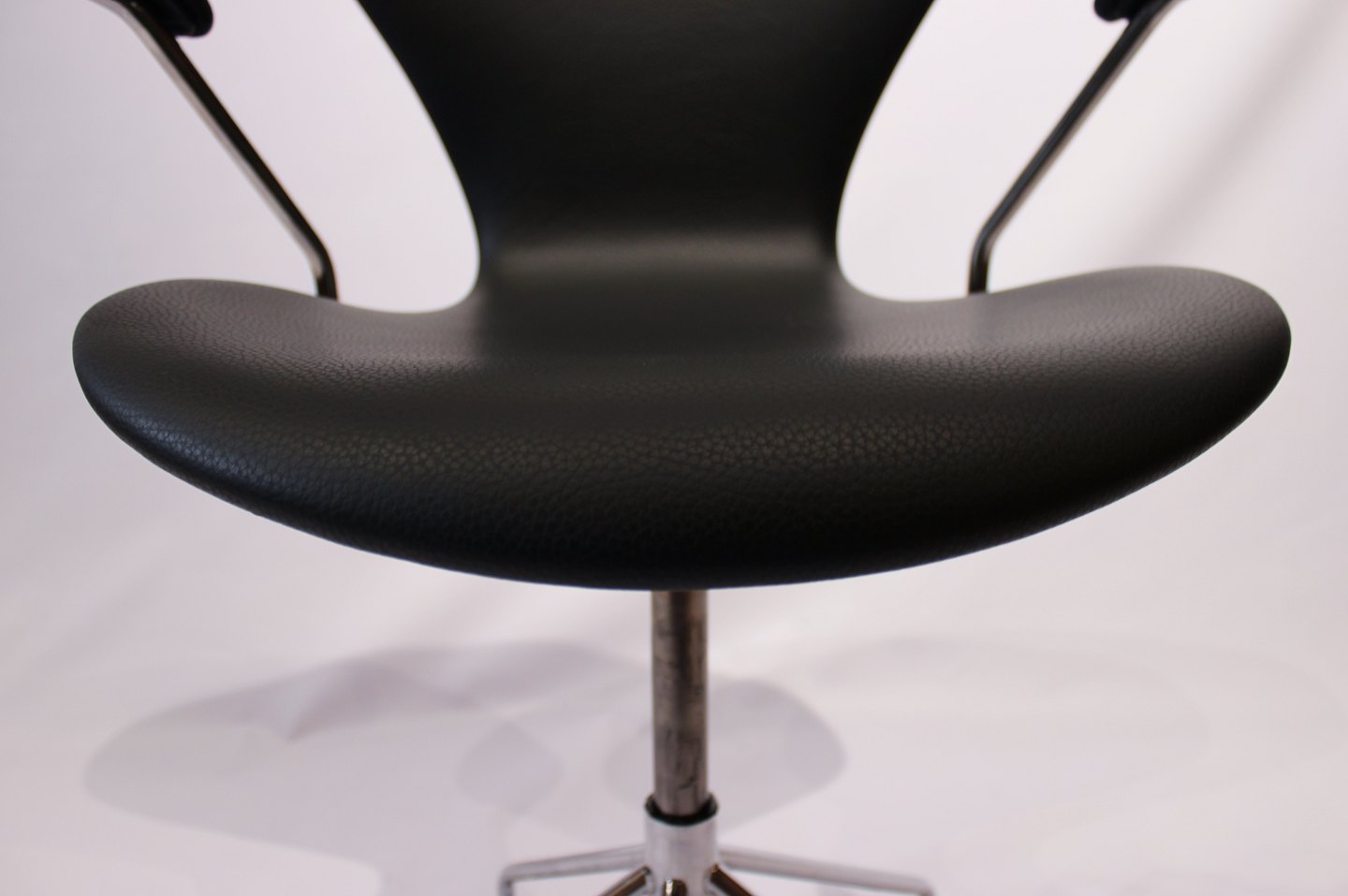 Solgt7'er kontorstol, model 3217, med armlæn og drejefunktion i sort læder designet af Arne Jacobsen i 1950erne og fremstillet af Fritz Hansen.