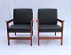 A pair of lounge chairs in polished wood and black classic leather of danish design from the 1960s. The chairs are in great vintage condition.