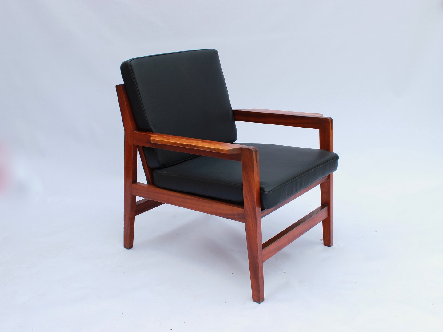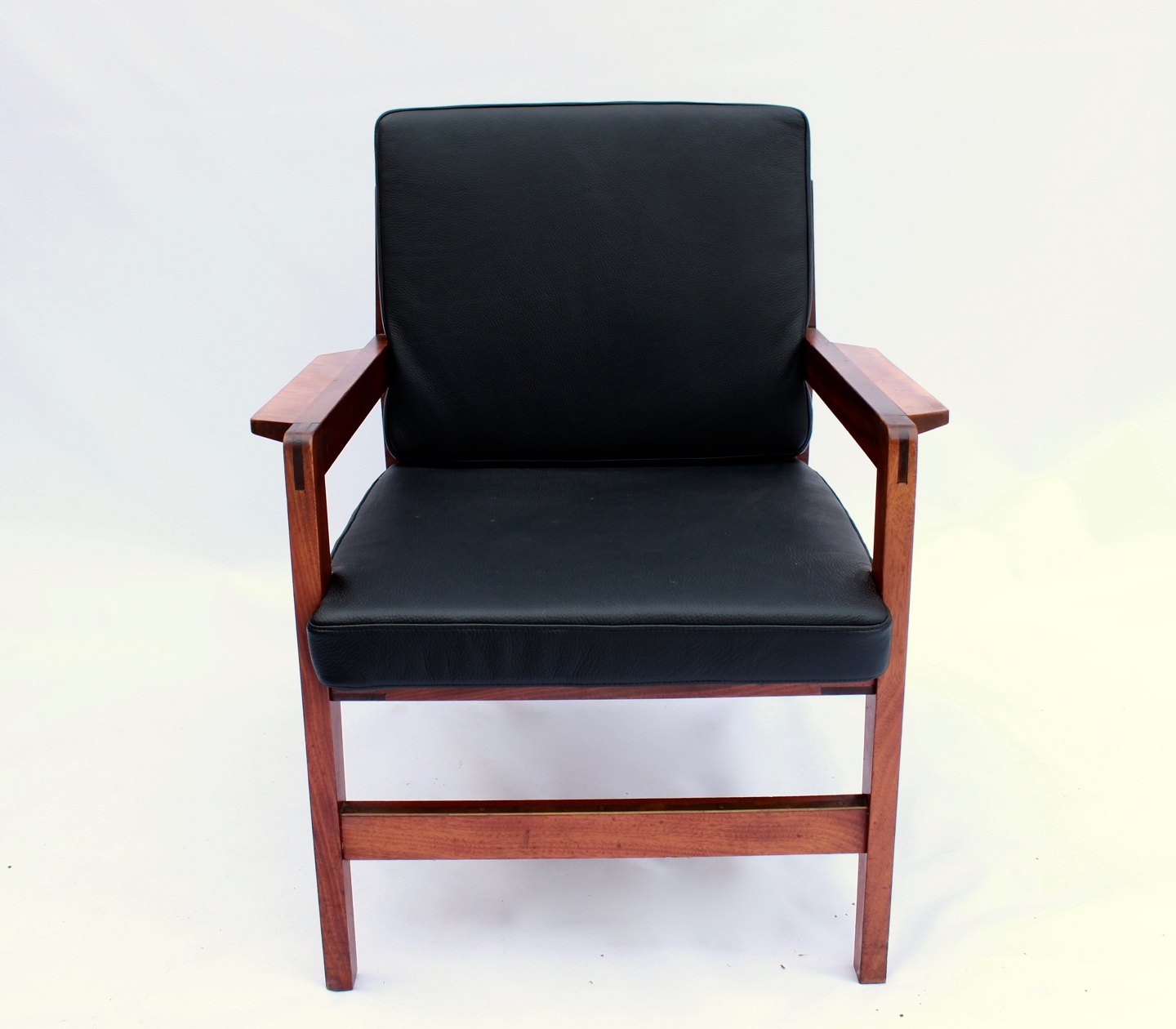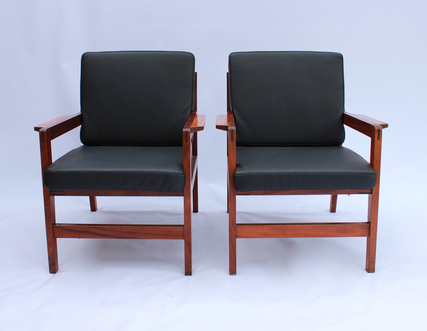 A pair of lounge chairs in polished wood and black classic leather of danish design from the 1960s.