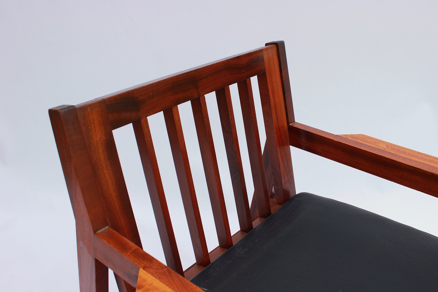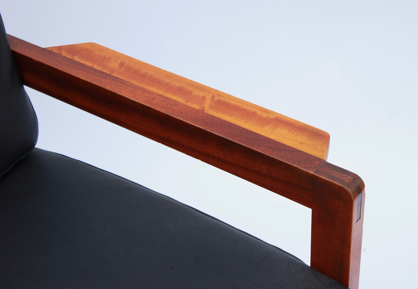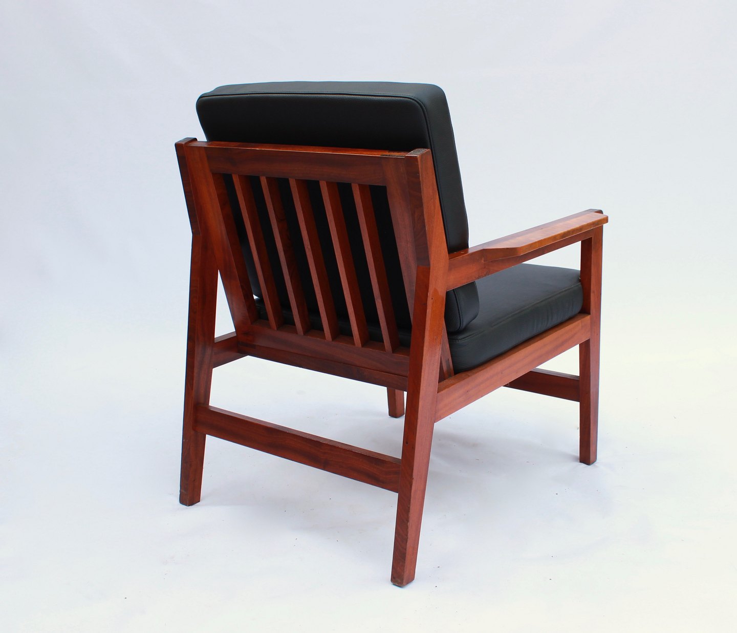 A pair of lounge chairs in polished wood and black classic leather of danish design from the 1960s.