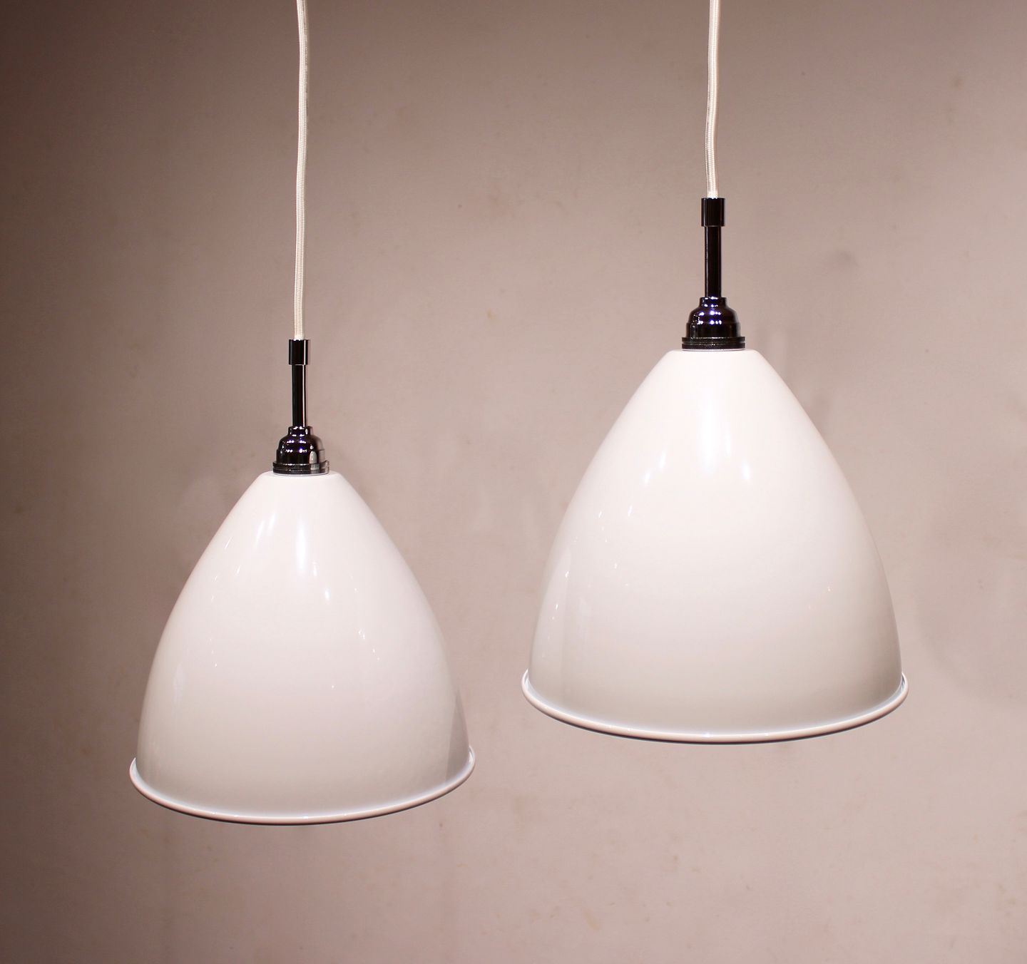 Et par hvide Bestlite pendler, model BL9, af Robert Dudley Best for Gubi.