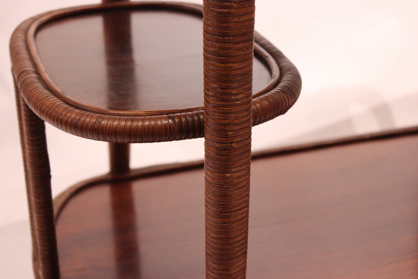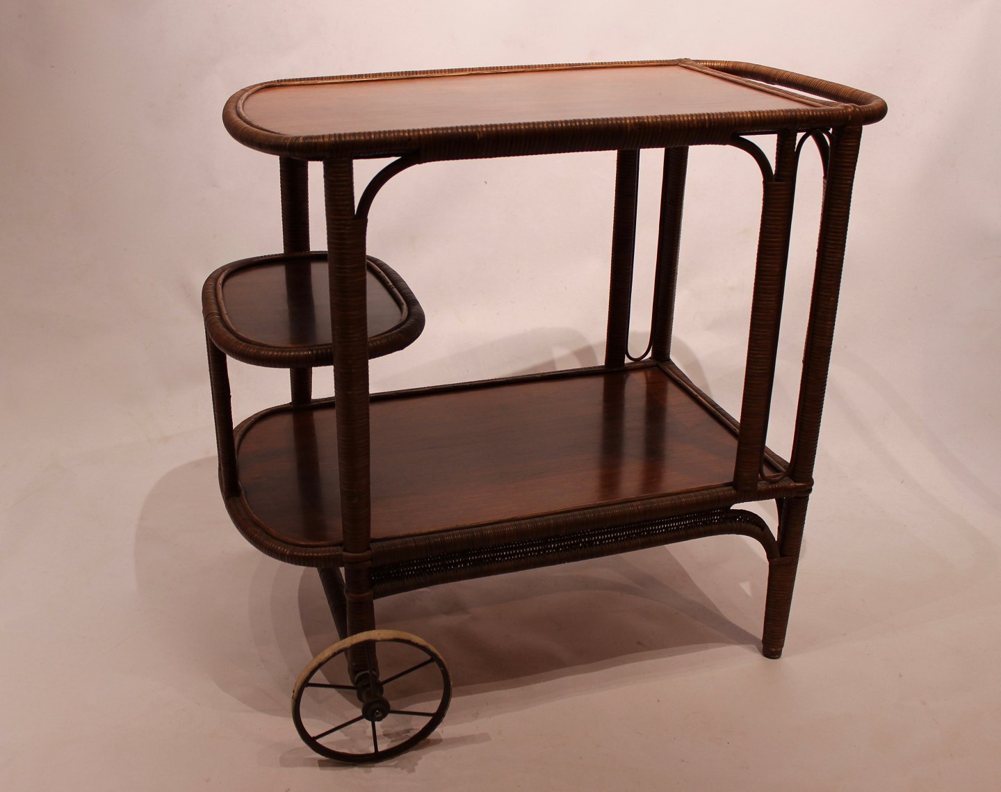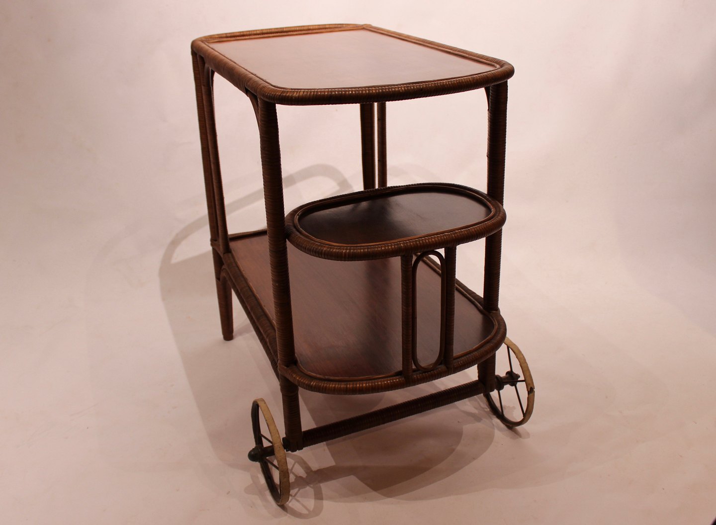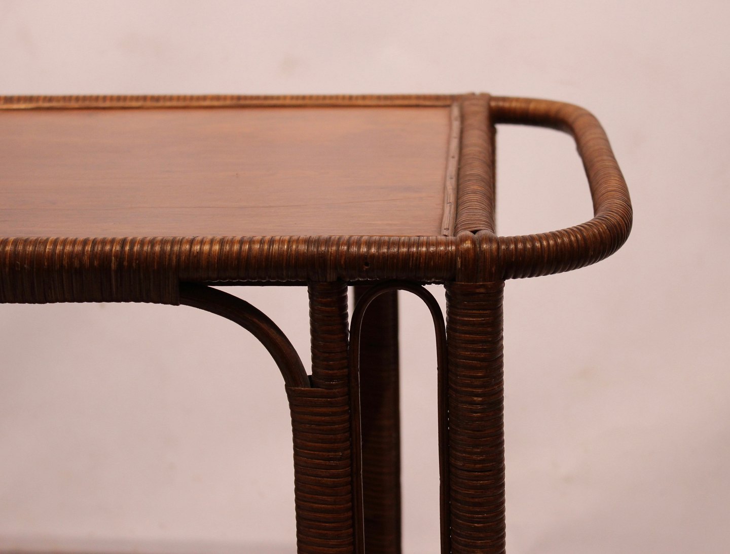 Antique french bar table of papercord and dark wood from around the 1920s.