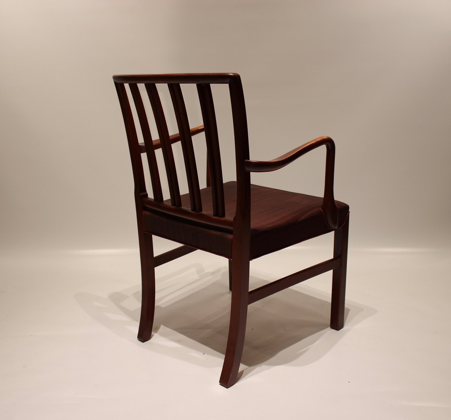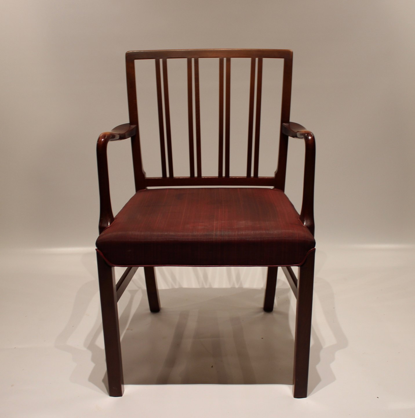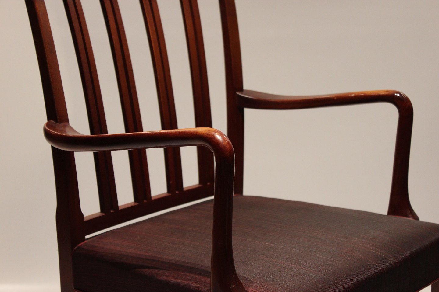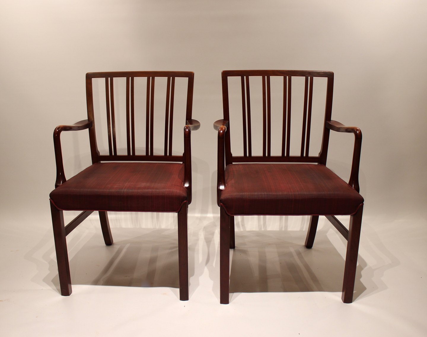 Disse armstole udstråler tidløs elegance og raffinement, med deres konstruktion i mahognitræ og polstring i rødt stof. De er designet af den ikoniske danske møbeldesigner Fritz Hansen i 1930'erne og er et sandt mesterværk inden for dansk møbeldesign.