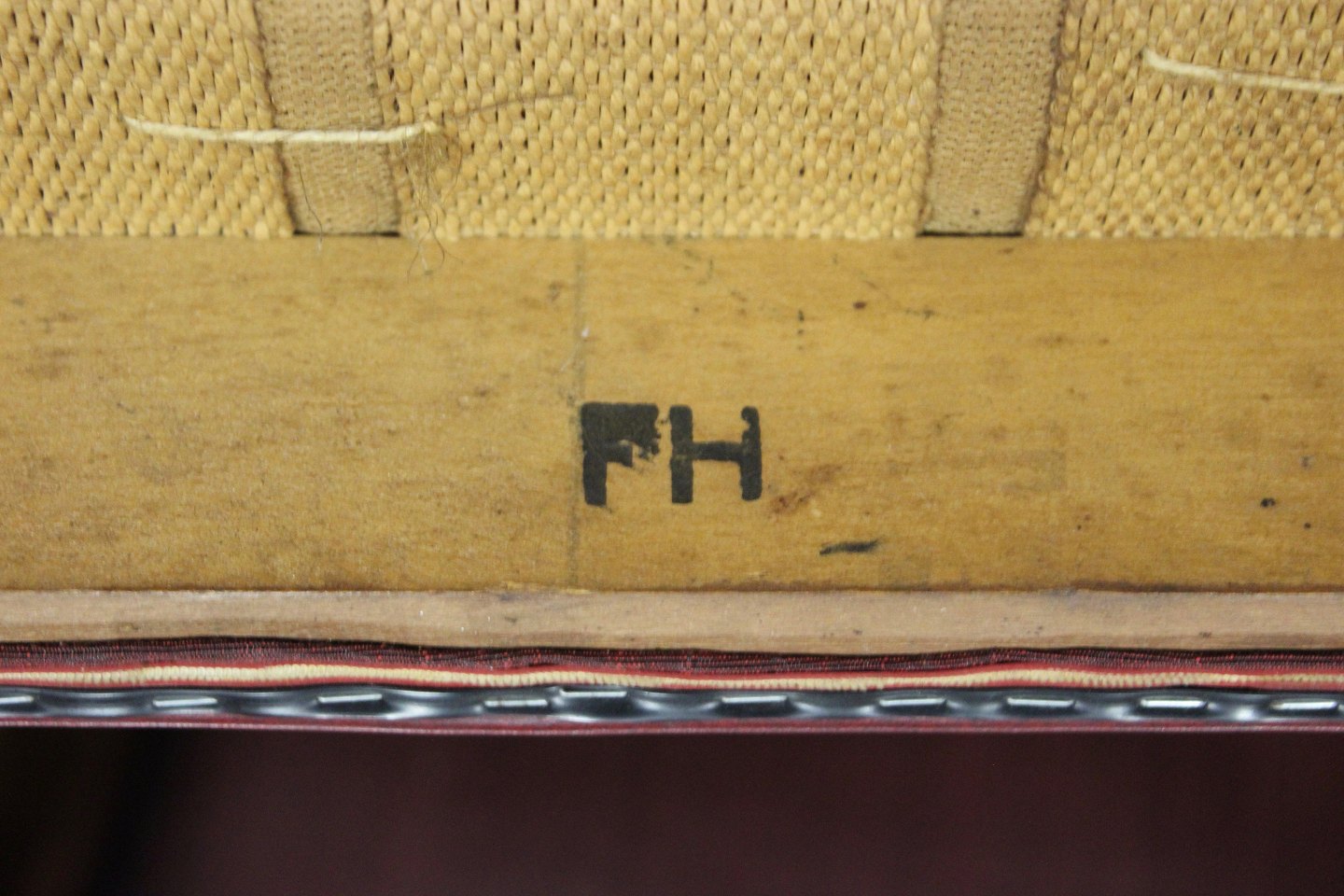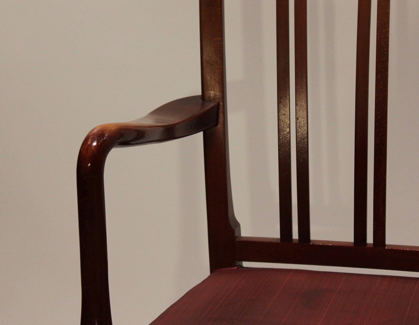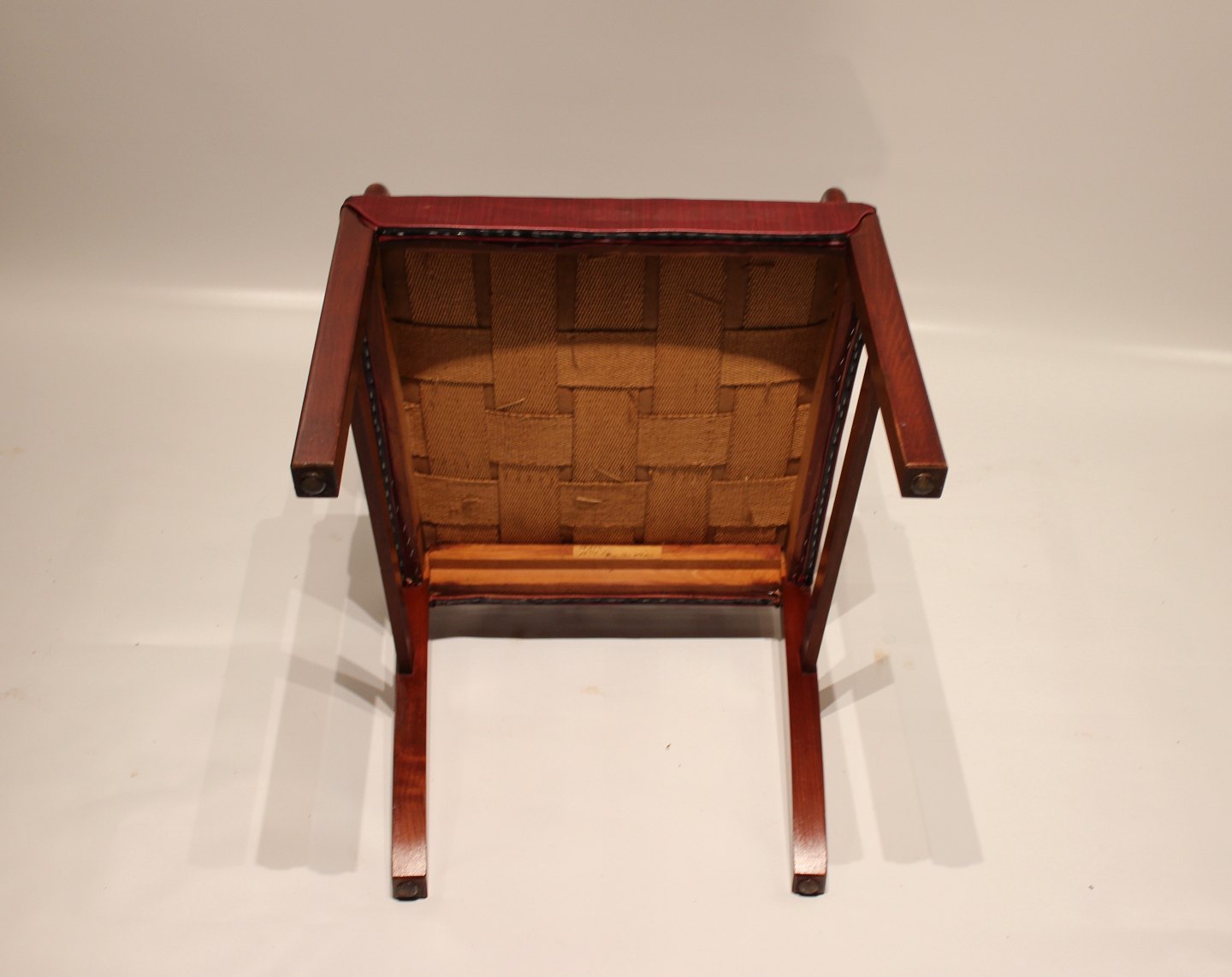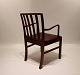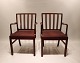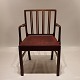 Disse armstole udstråler tidløs elegance og raffinement, med deres konstruktion i mahognitræ og polstring i rødt stof. De er designet af den ikoniske danske møbeldesigner Fritz Hansen i 1930'erne og er et sandt mesterværk inden for dansk møbeldesign.