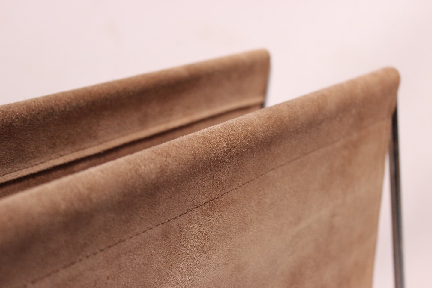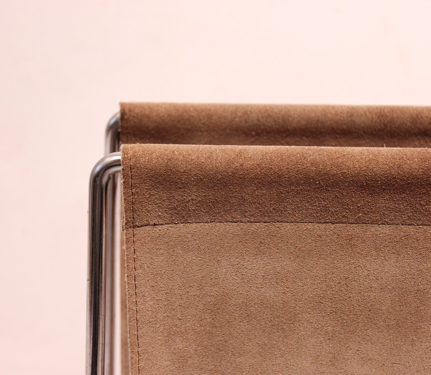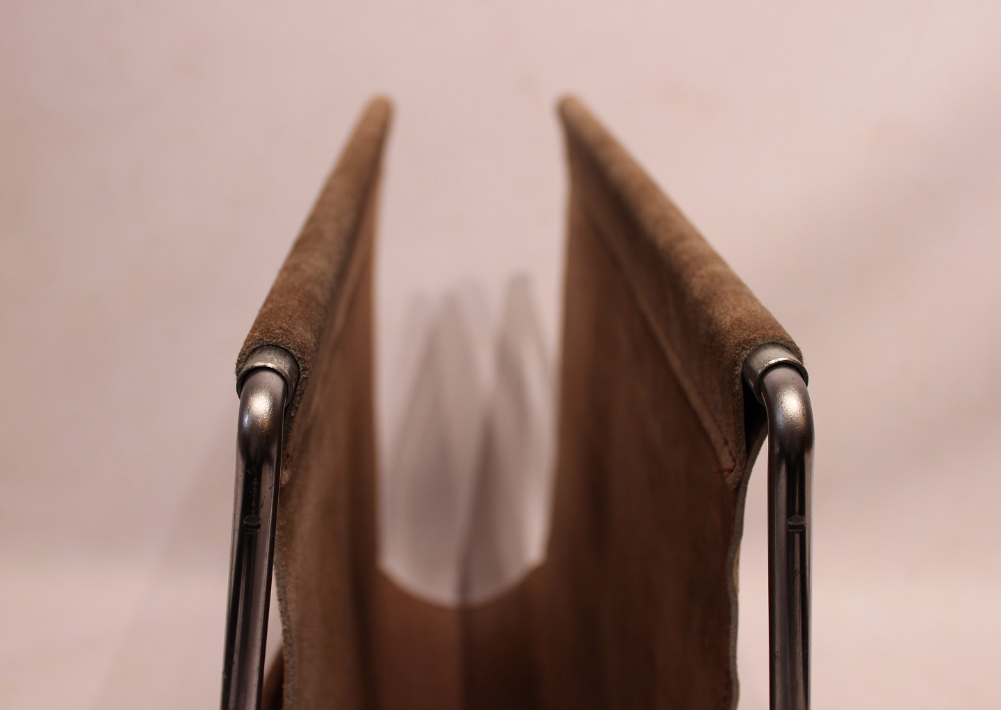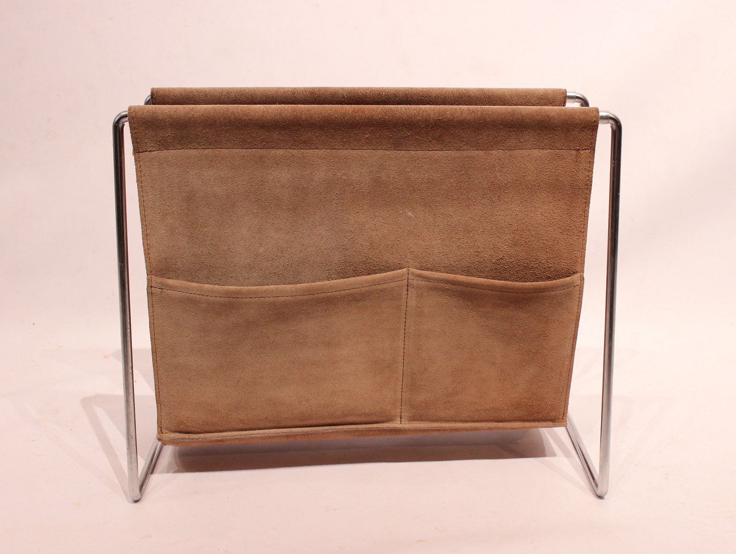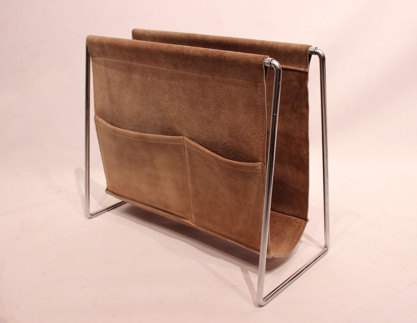 SoldNewspaper rack in light suede and metal by Verner Panton.