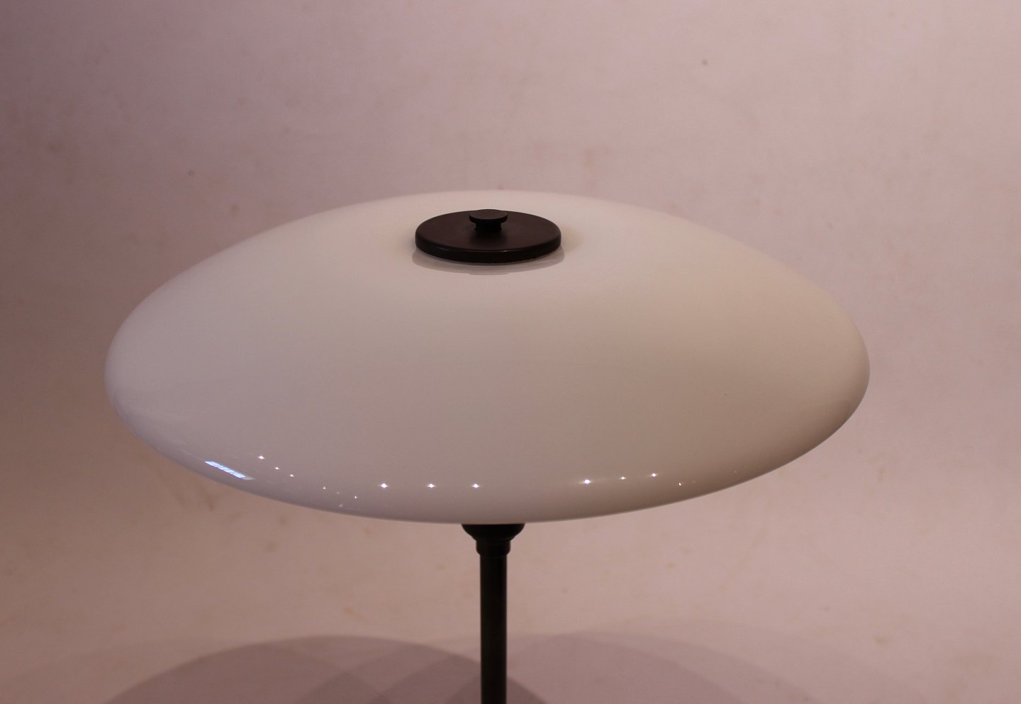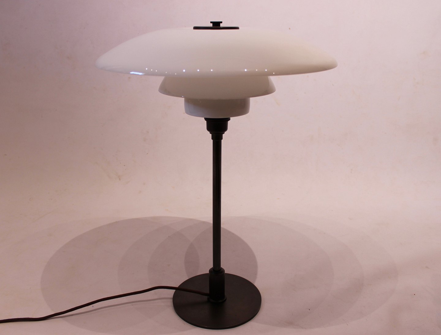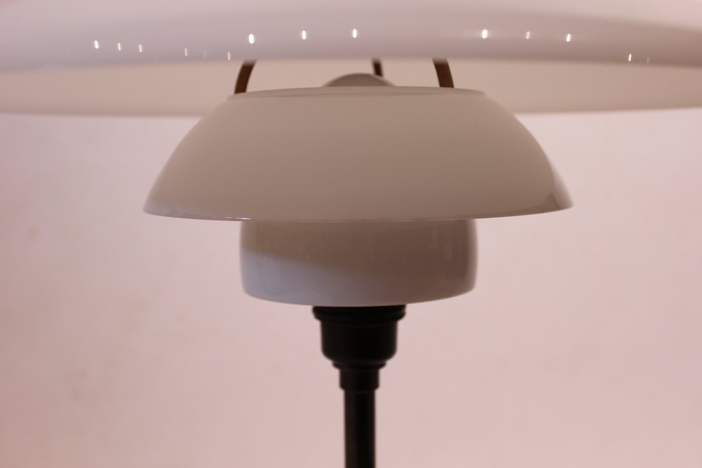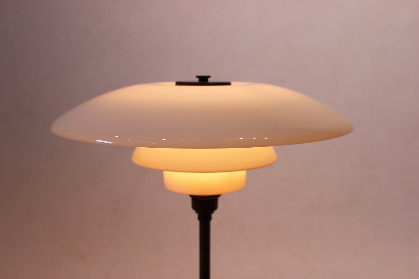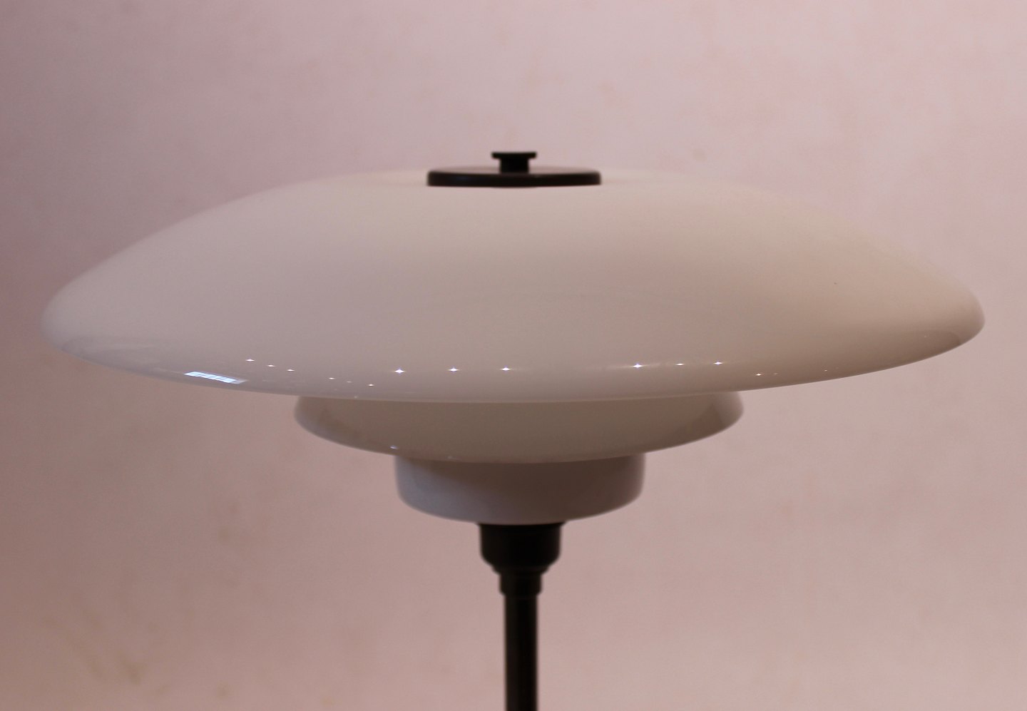 The lamp has a white opal glass shade, which provides a comfortable and even light distribution. Opal glass is popular in the PH lamps because of its ability to create a soft, non-glare lighting that diffuses the light beautifully.