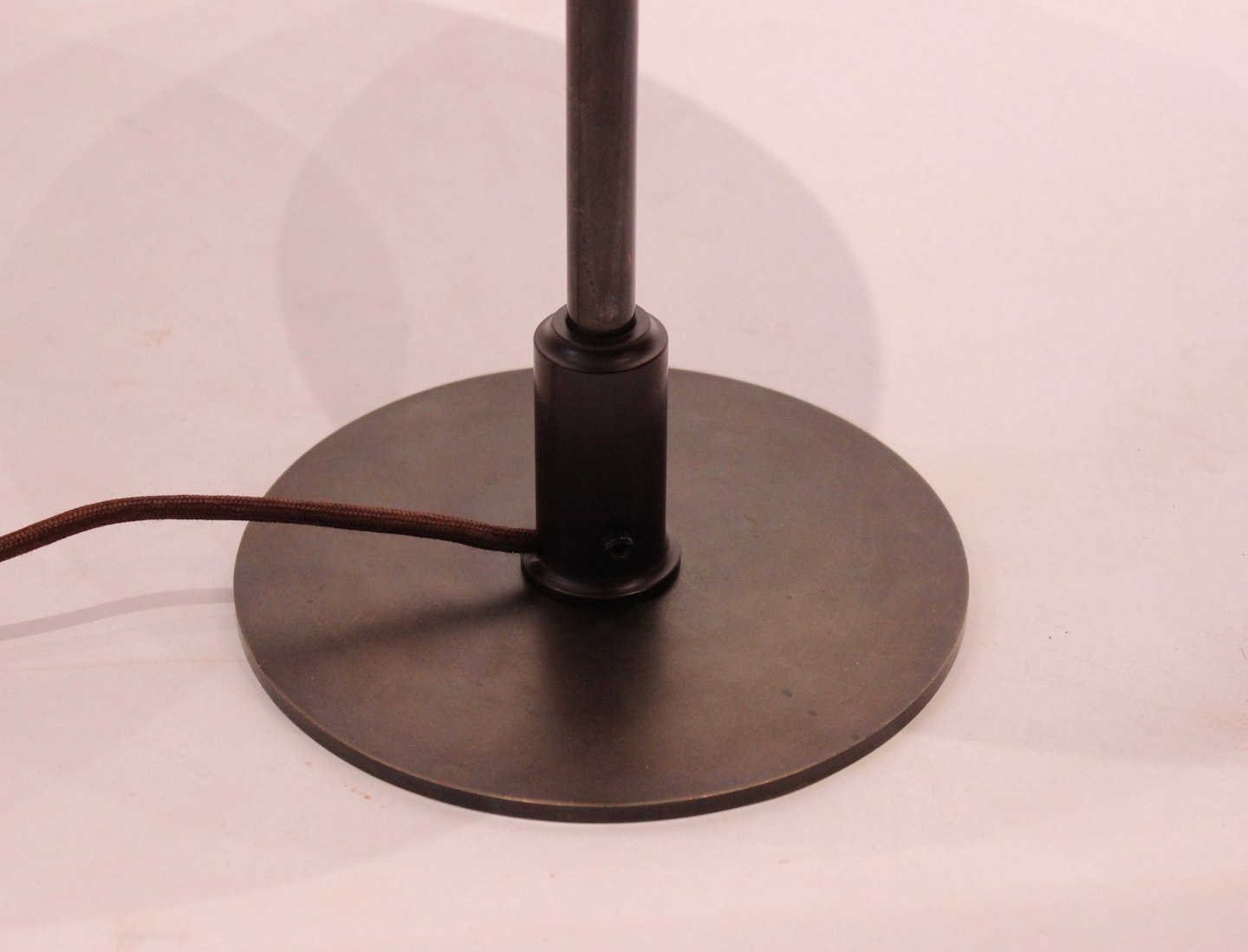 The lamp is made of bronzed brass, which gives the lamp a subtle and warm tone that complements the white opal glass. Burnished brass is a surface treatment that gives a slightly vintage look, which contributes to the lamp's vintage charm.