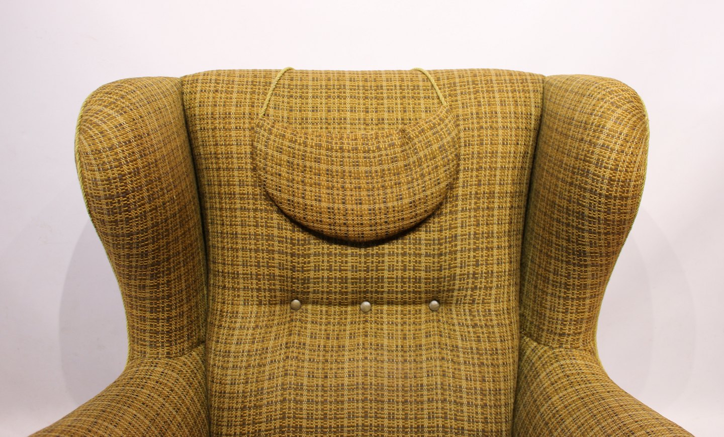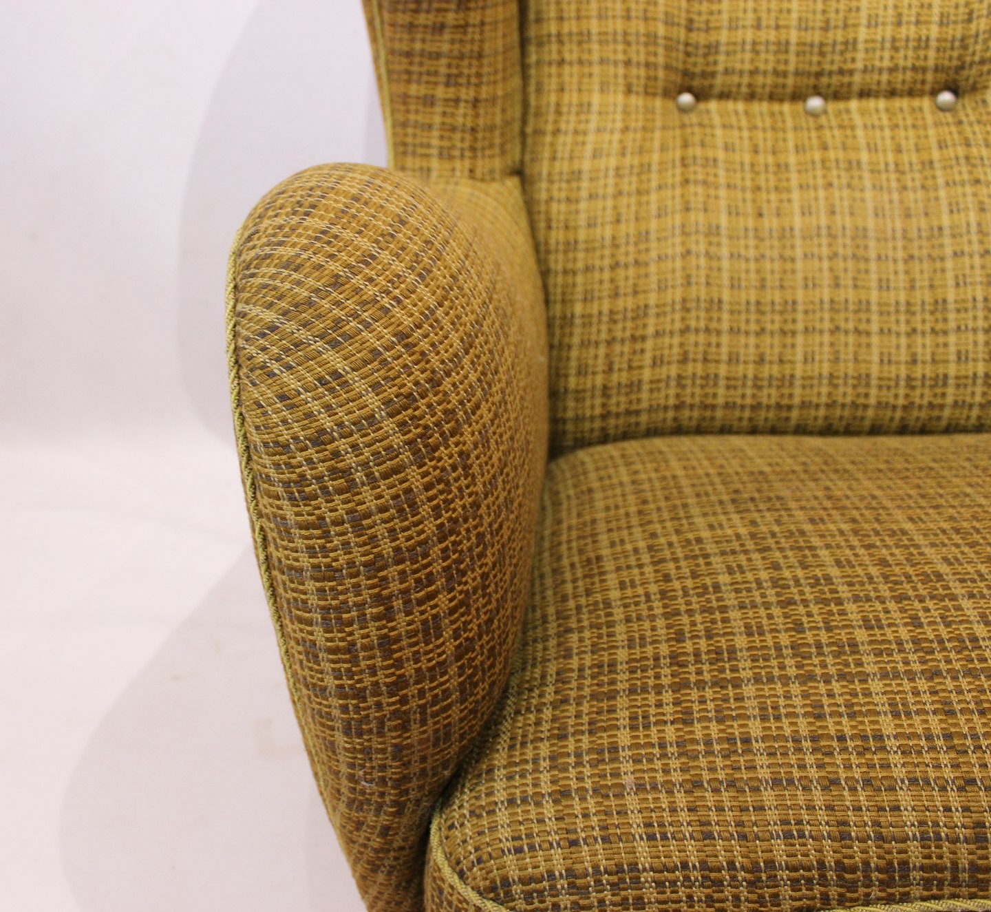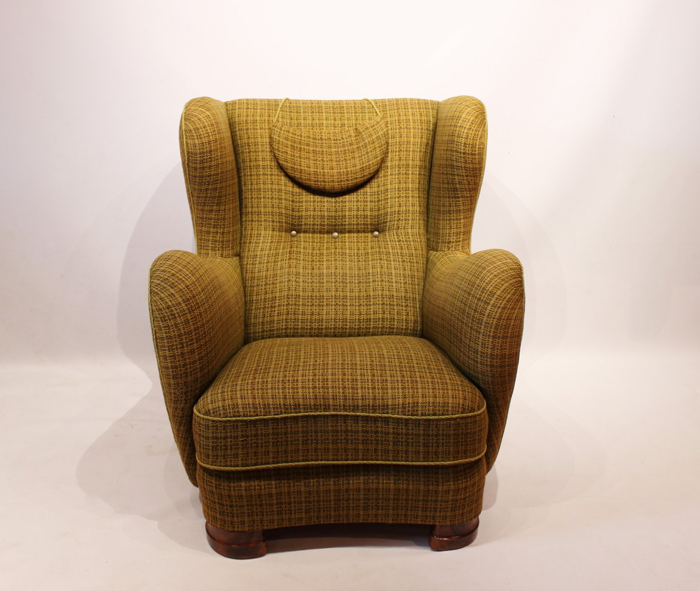 SolgtLænestol overpolstret i mørkegrønt uldstof, stolen er af dansk design fra 1930erne og er i flot brugt stand.