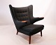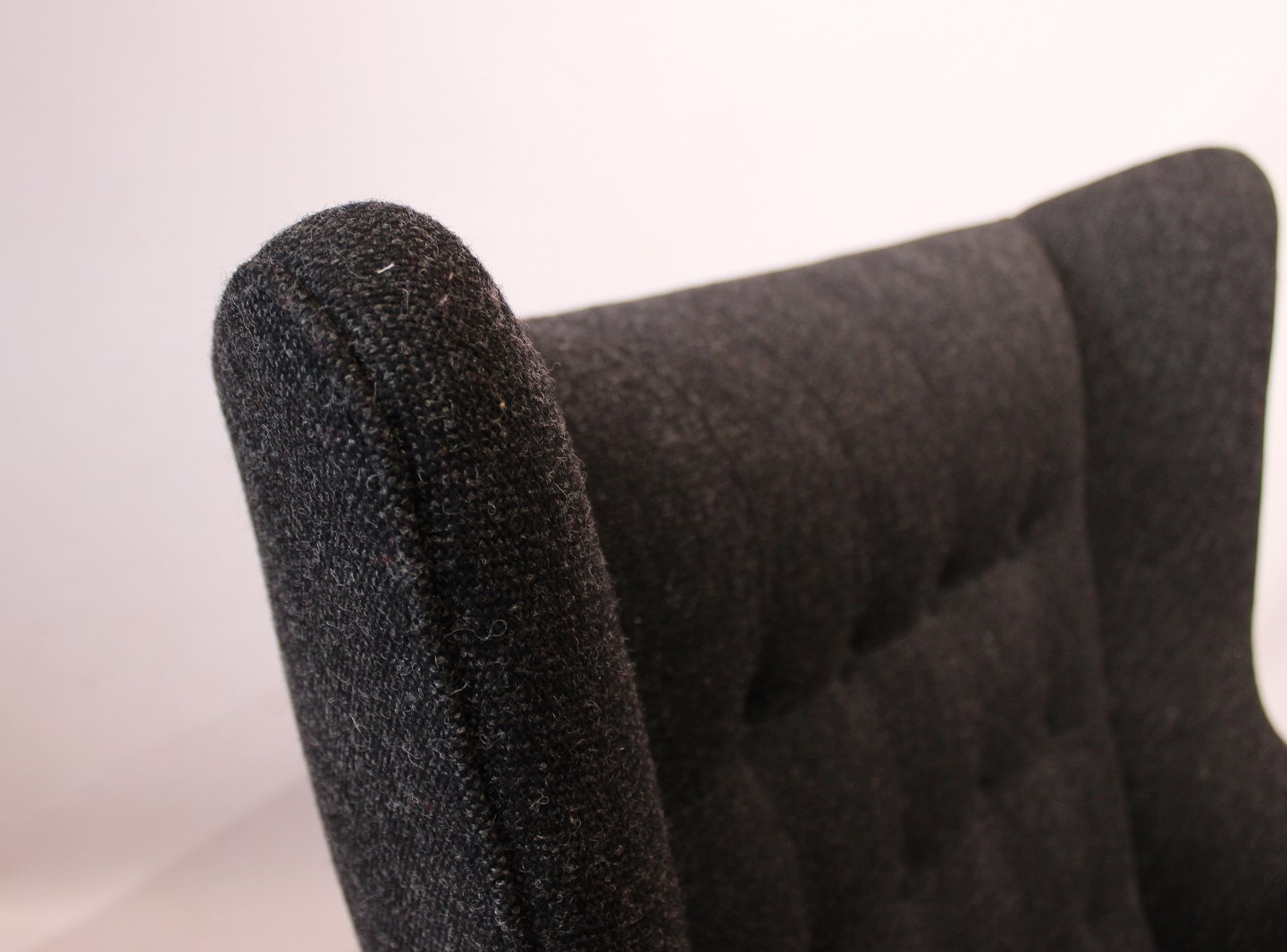 Hans J. Wegner, known for his skill in ergonomics and woodwork, created the Bams chair with a vision of combining comfort and aesthetics. The chair has wide, padded armrests and a high back that provides excellent support and comfort. The solid wooden legs, typically made of oak or walnut, add a warm and natural contrast to the padded seat and back.