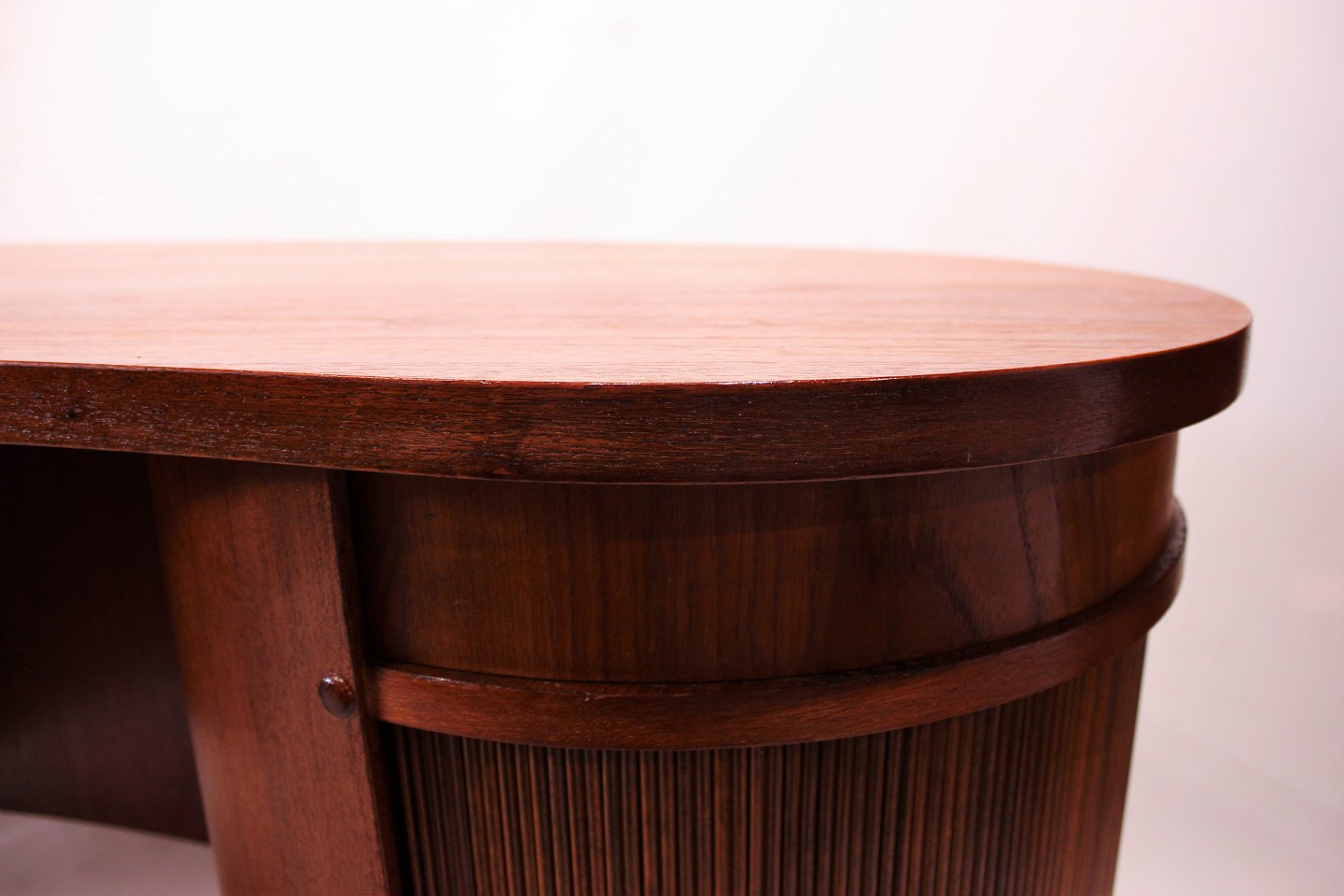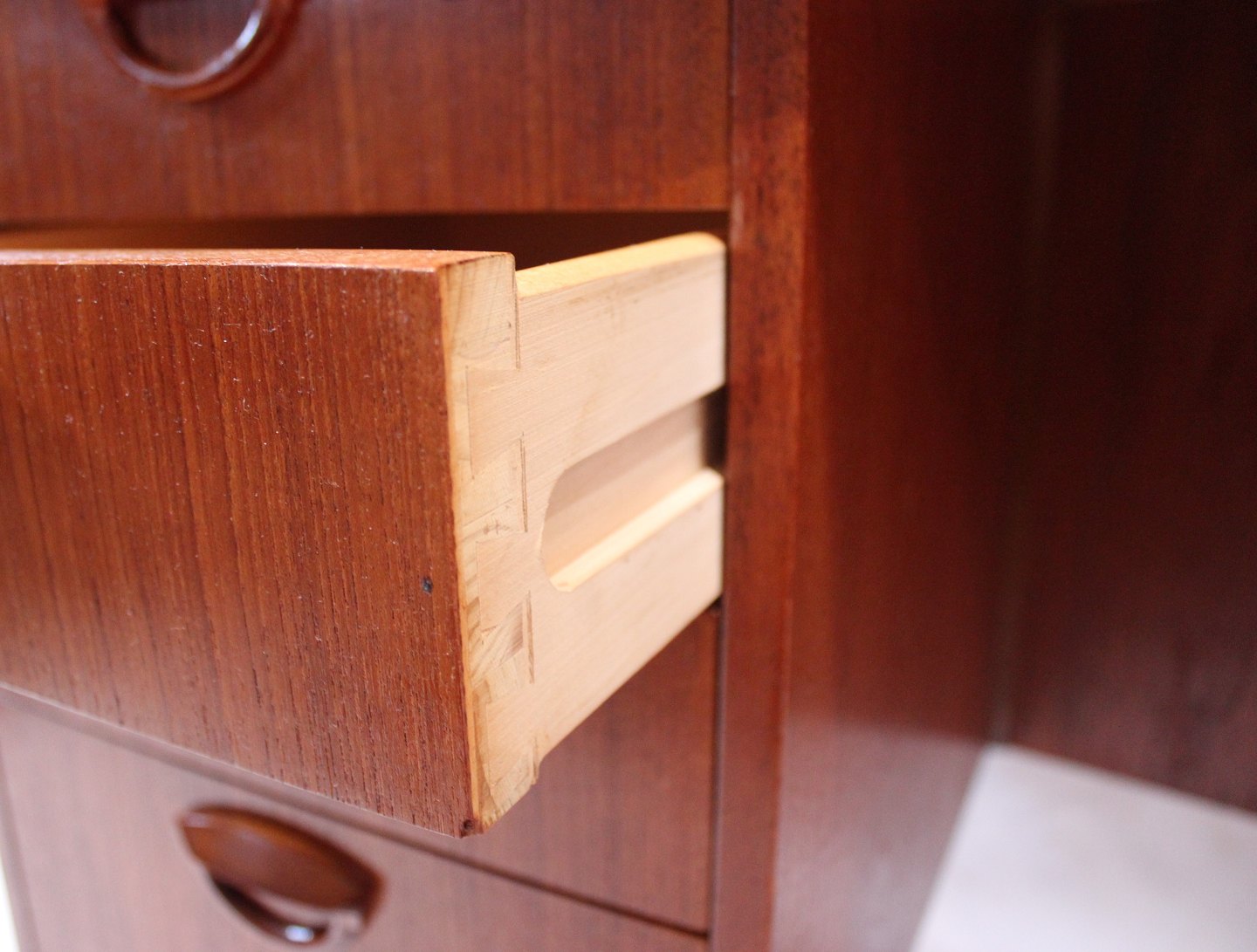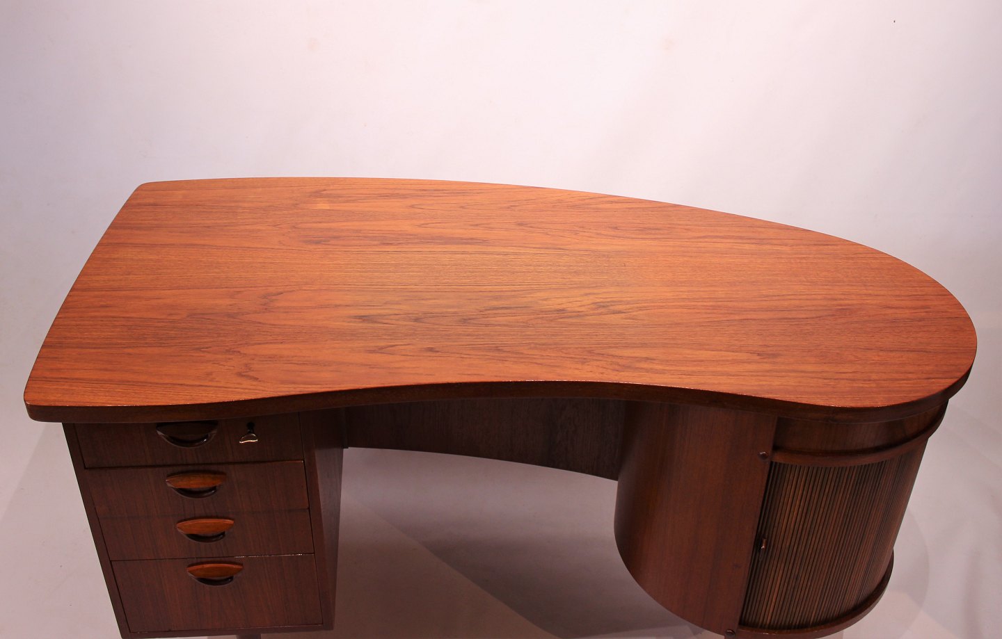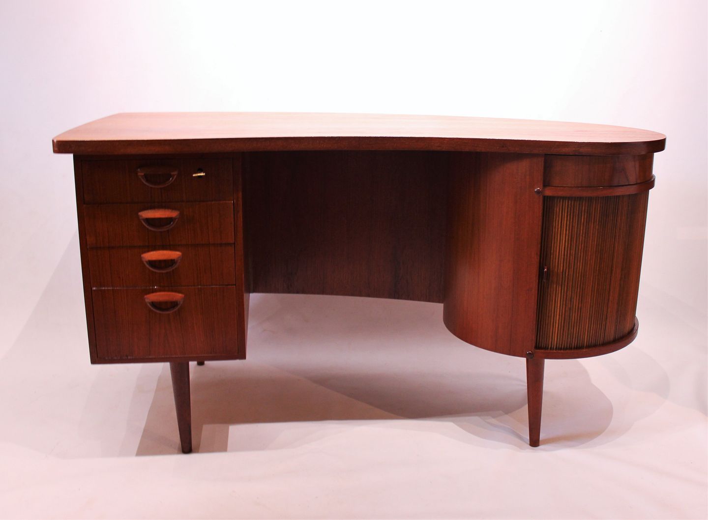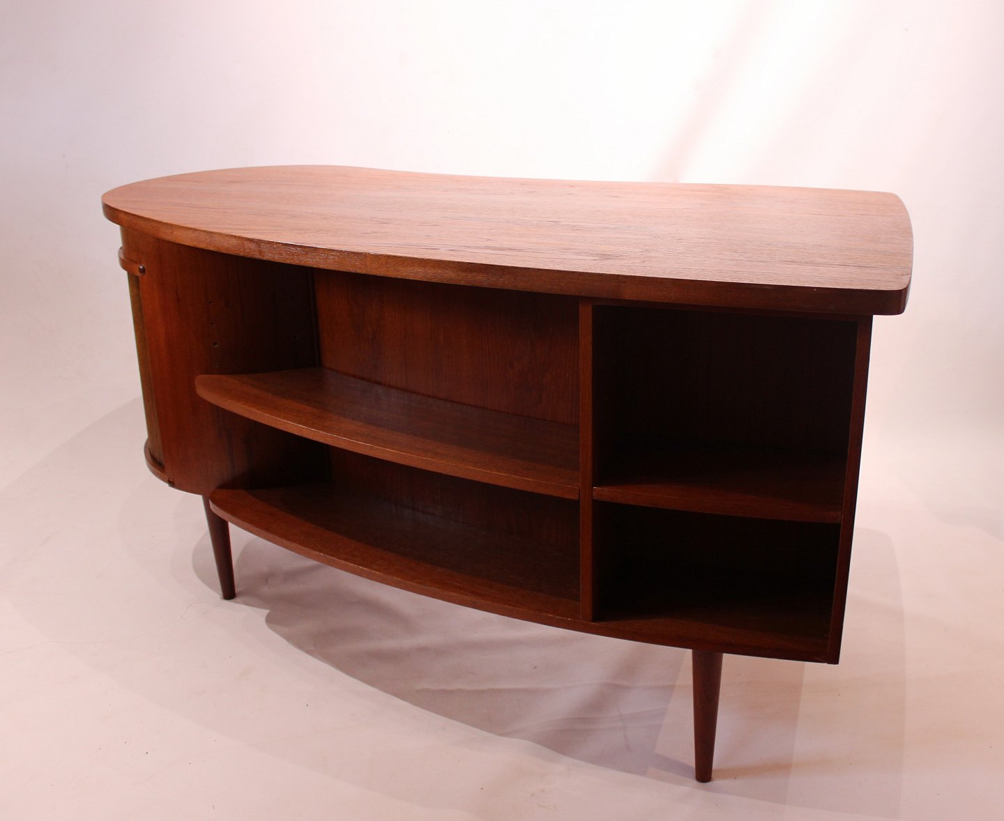 Desk with sliding door and bar cabinet, of teak and designed by Kai Kristiansen.