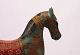 Large wooden figure in the shape of a horse decorated with different dark colours from the 1920s.