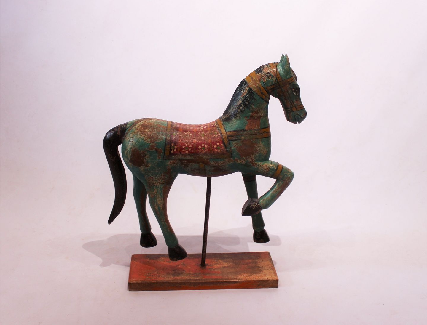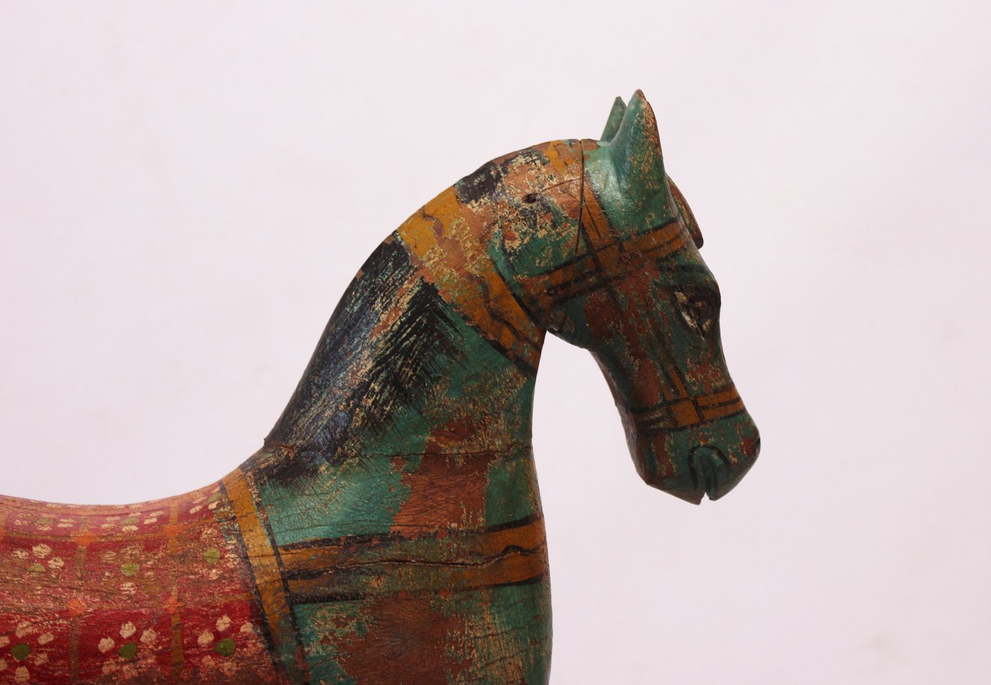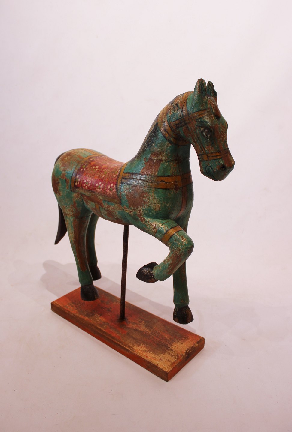 Large wooden figure in the shape of a horse decorated with different dark colours from the 1920s. The figure is in great vintage condition.