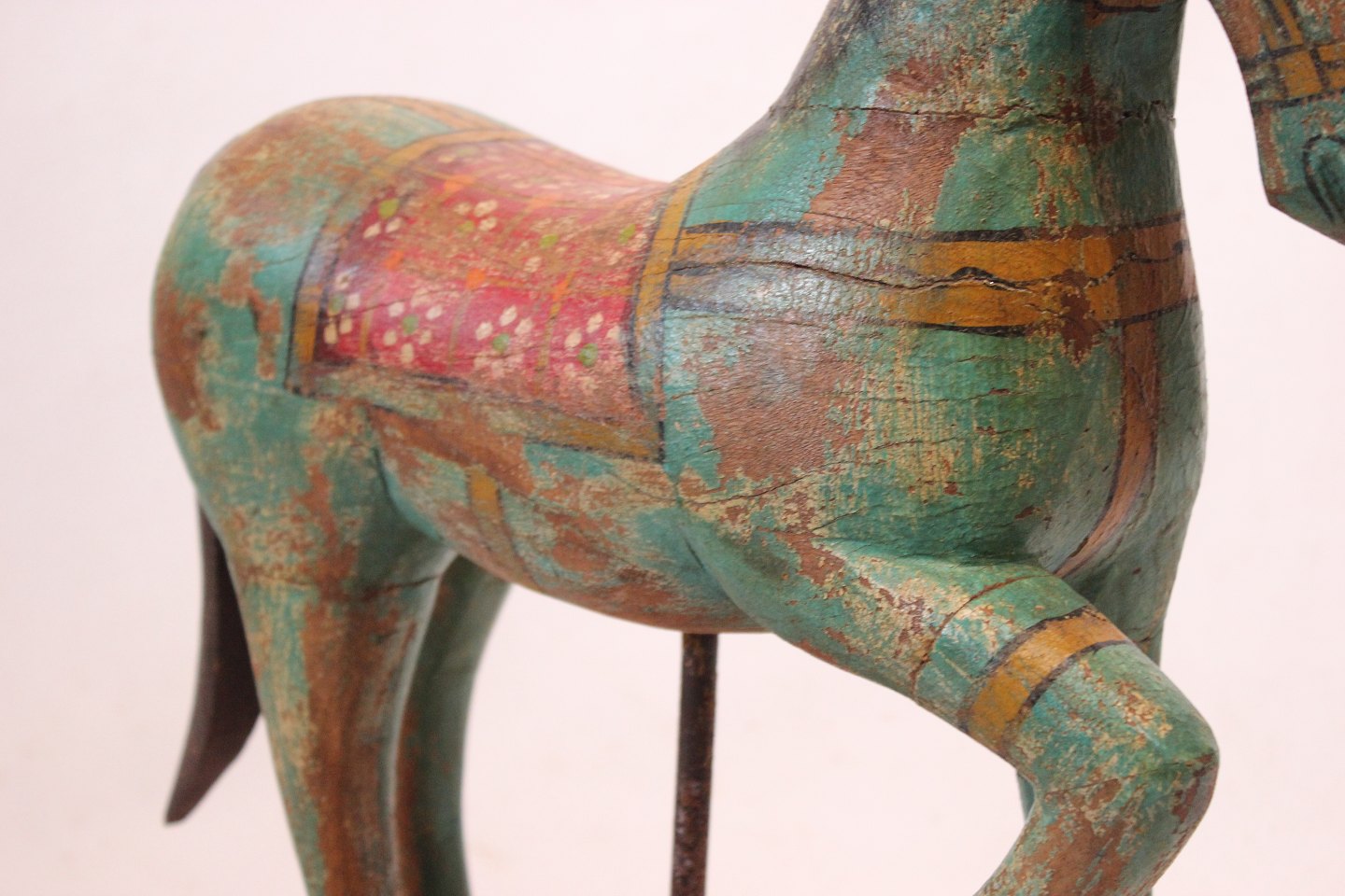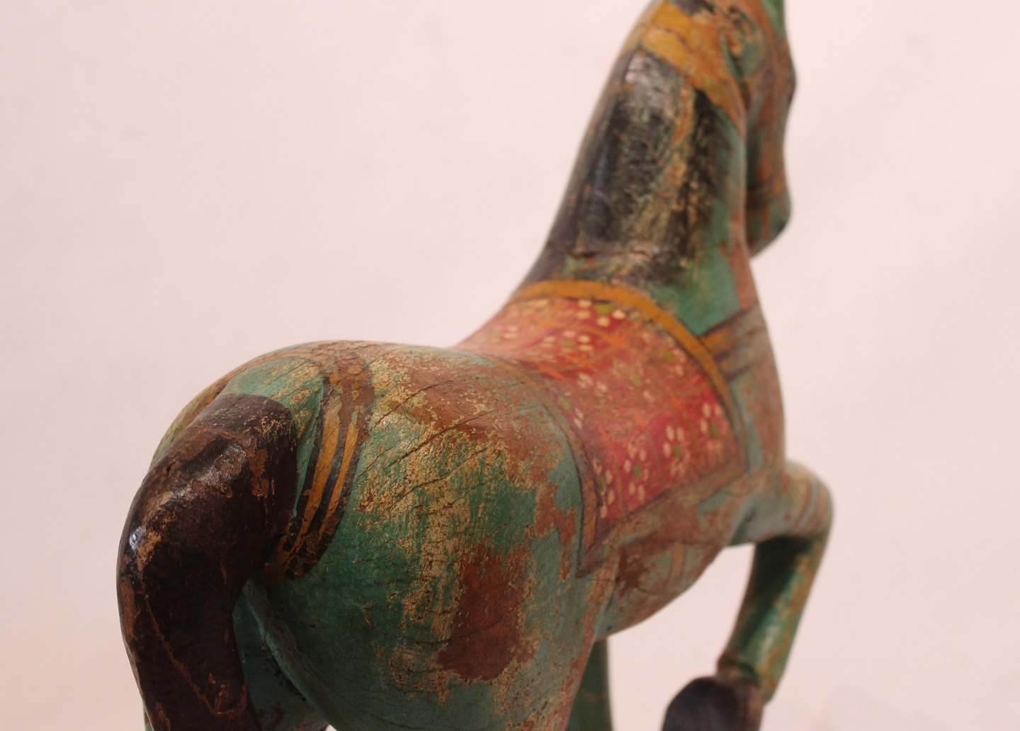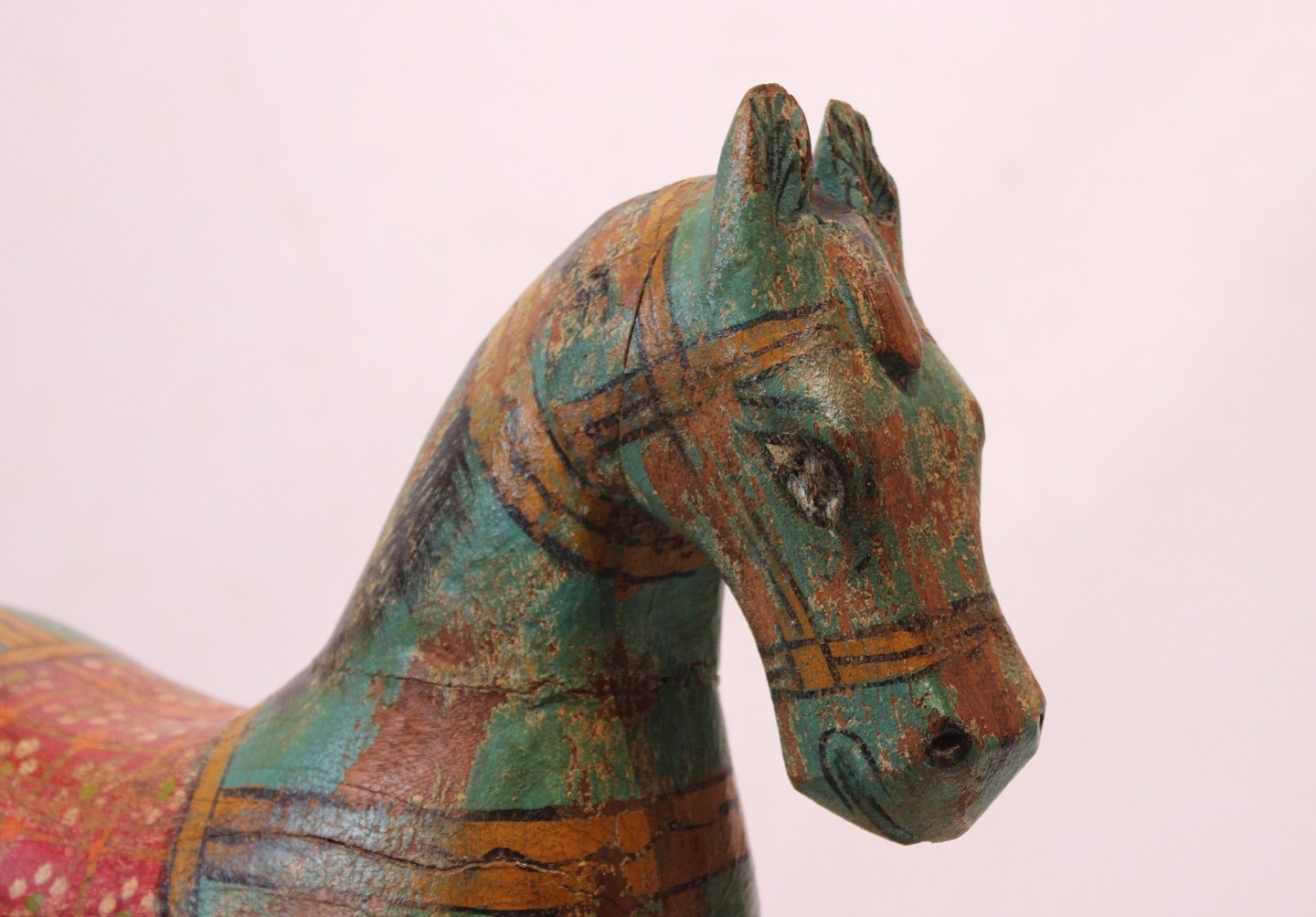 Large wooden figure in the shape of a horse decorated with different dark colours from the 1920s. The figure is in great vintage condition.