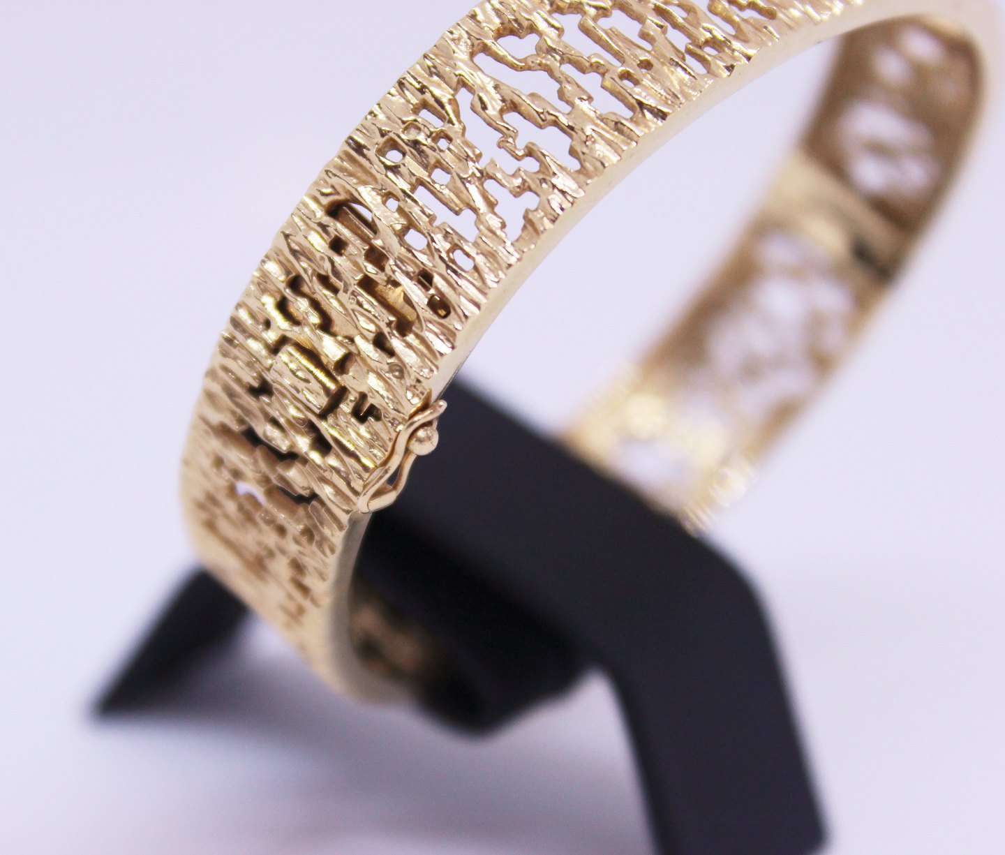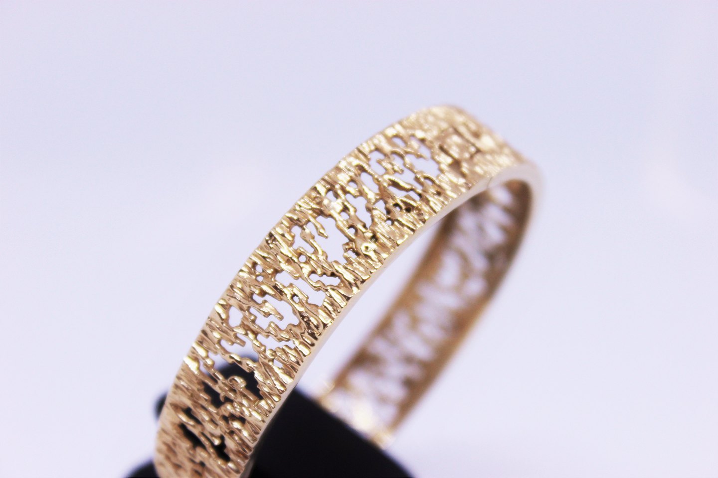 Sold14 carat gold bangle decorated finnish inspired open work and stamped BH by the goldsmith Bernhard Hertz.