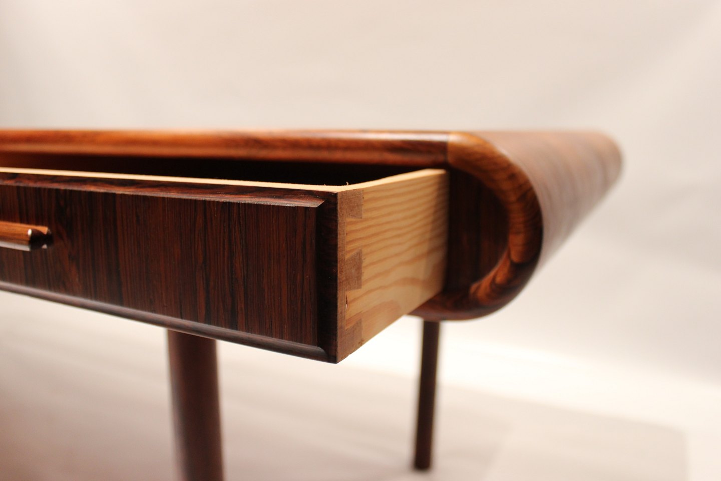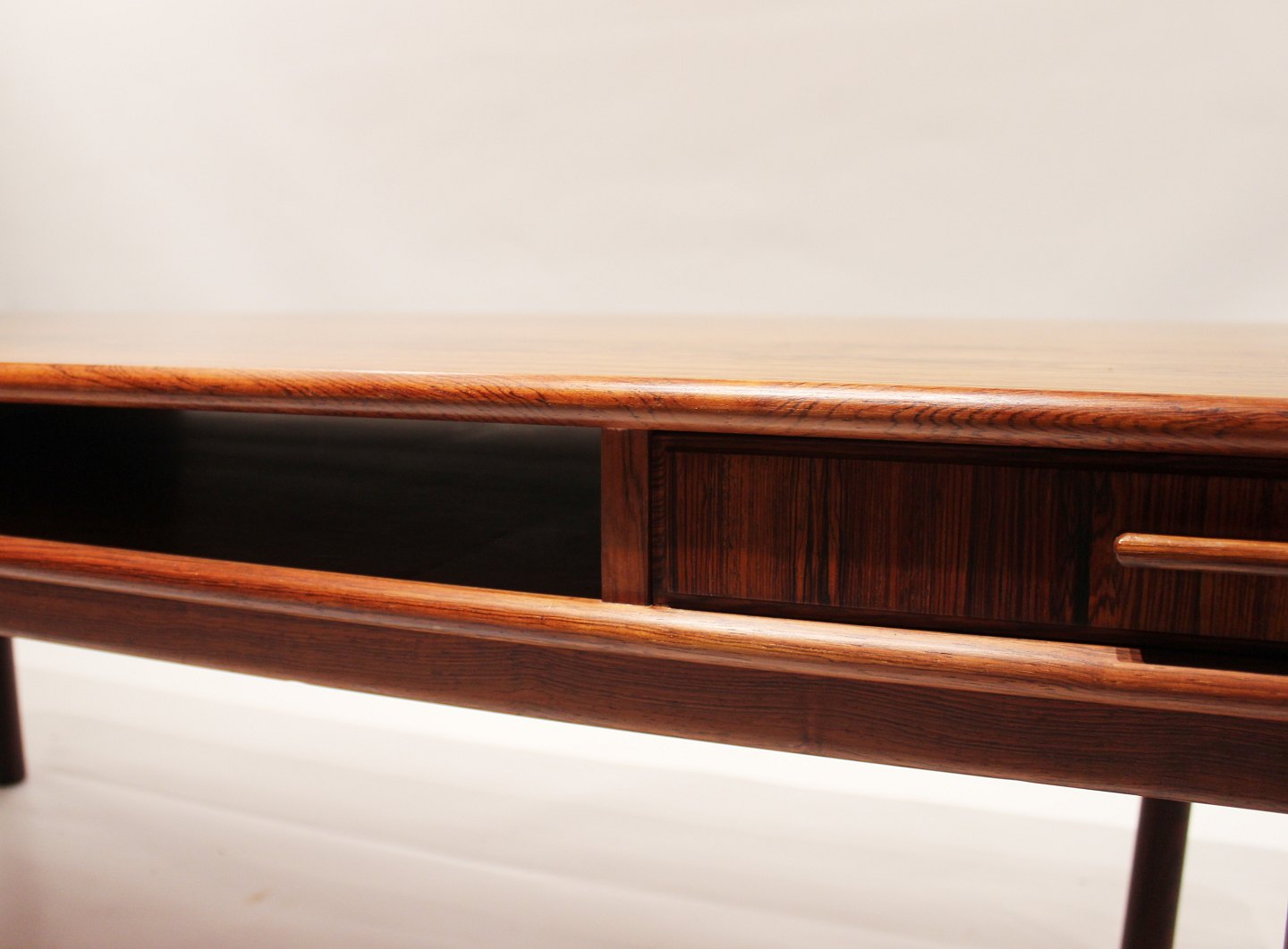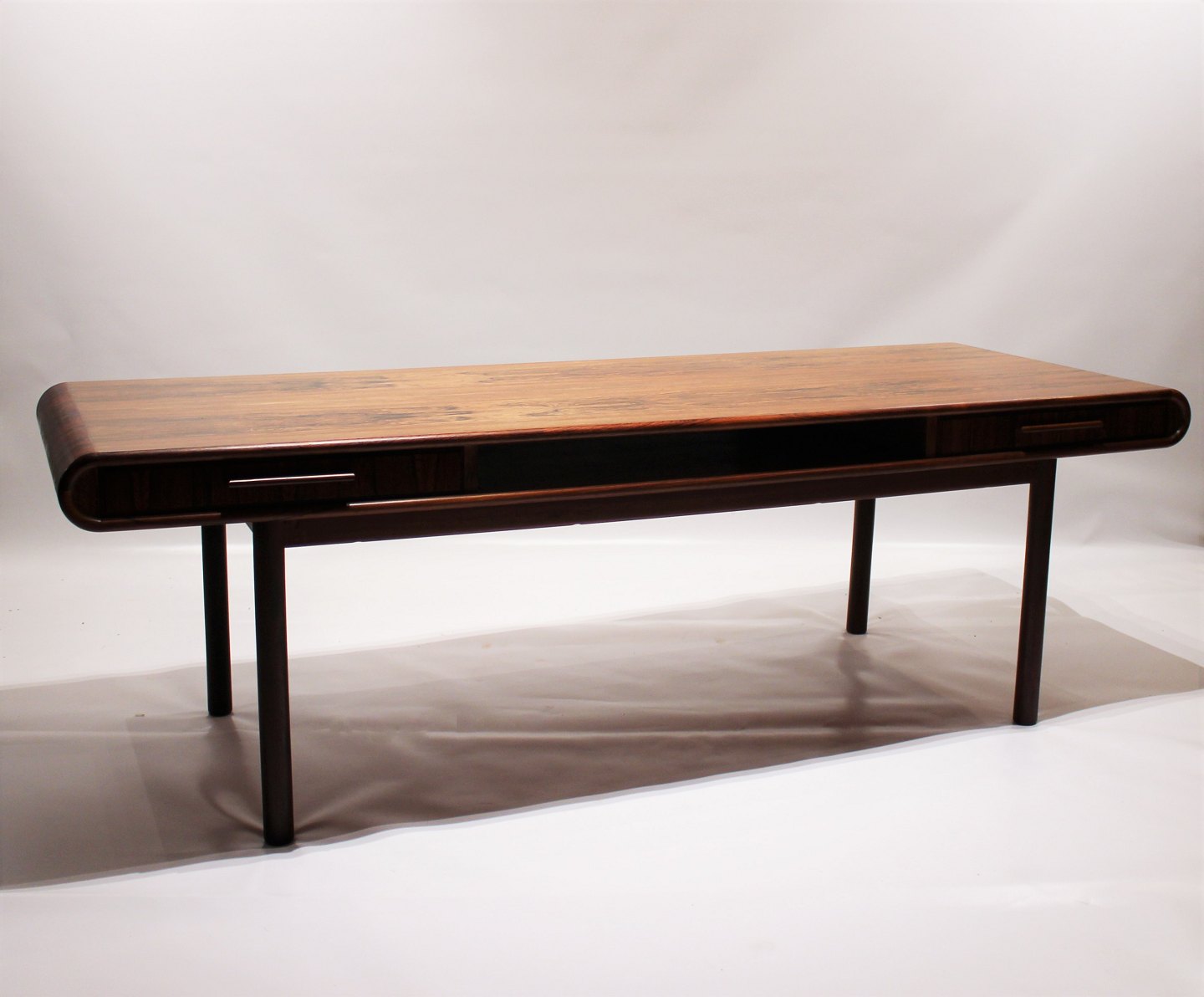 SoldCoffee table in rosewood with curved edges of danish design from the 1960s. The table is with an open shelf, drawers and in great vintage condition.