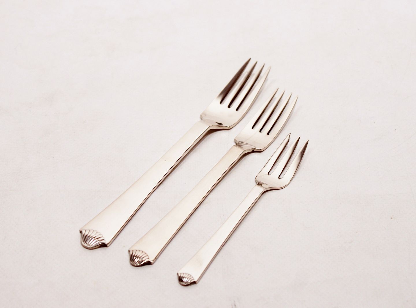 Middagsgaffel (650 kr.), frokostgaffel (600 kr.) og kagegaffel (475 kr.) i Arvesølv nr. 4 af Hans Hansen. Spørg for antal på lager.