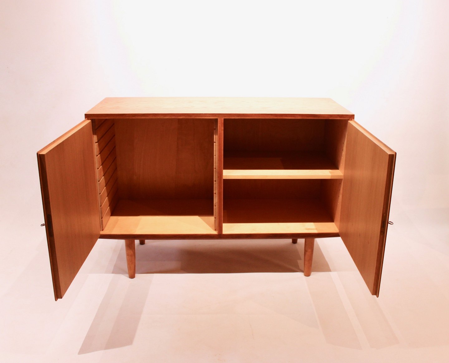 SolgtSkænk af egetræ med to låger af dansk design fra 1960erne. Skænken er i flot brugt stand og vi har to på lager i alt, men sælges enkeltvis.