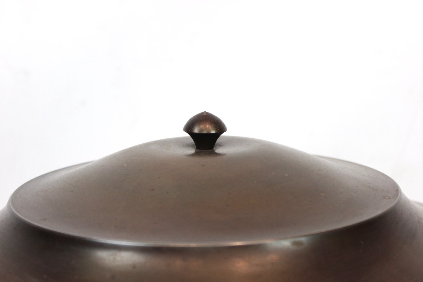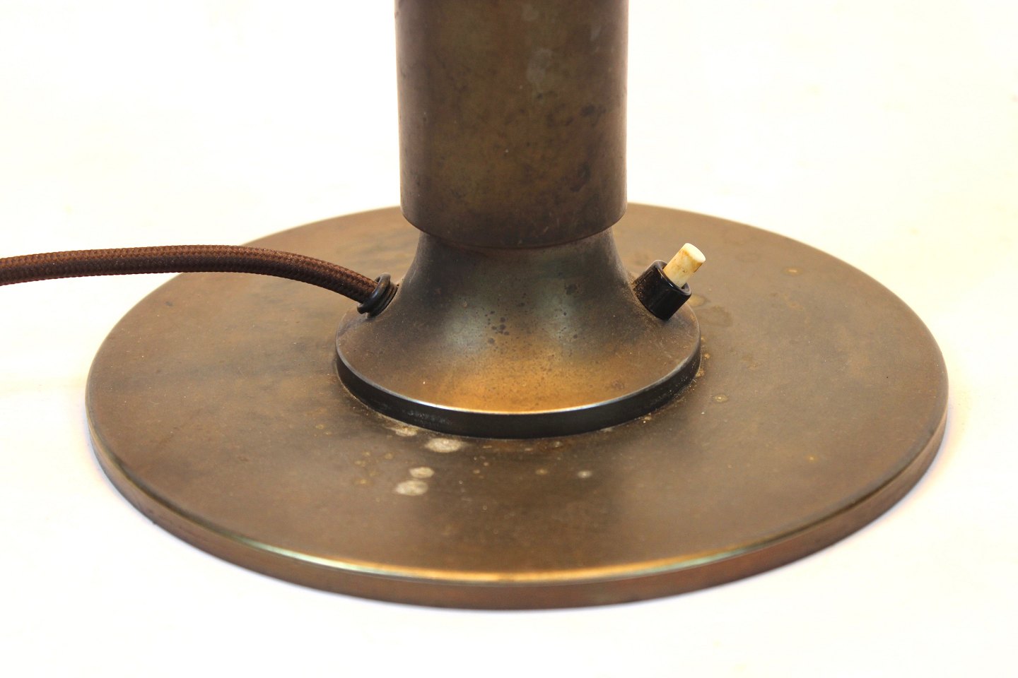 The Torch lamp with stem of amber colored glass and foot and shade of patinated brass. The lamp is by Fog and Mørup from the 1930s.